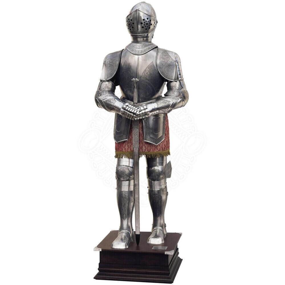 I 1500-tallet, særligt under kejser Karl V, udviklede pladerustningen sig fra ren slagmarksbeskyttelse til et luksuriøst statussymbol. Selvom skydevåben i 1600-tallet gradvist gjorde rustninger overflødige i kamp, bestod deres værdi som tegn på adel, rigdom og magt. Denne replika hylder netop den periode, hvor rustningskunst nærmede sig skulptur – og hvor ætsningsteknikker blev brugt til at fremhæve højadelens prestige.