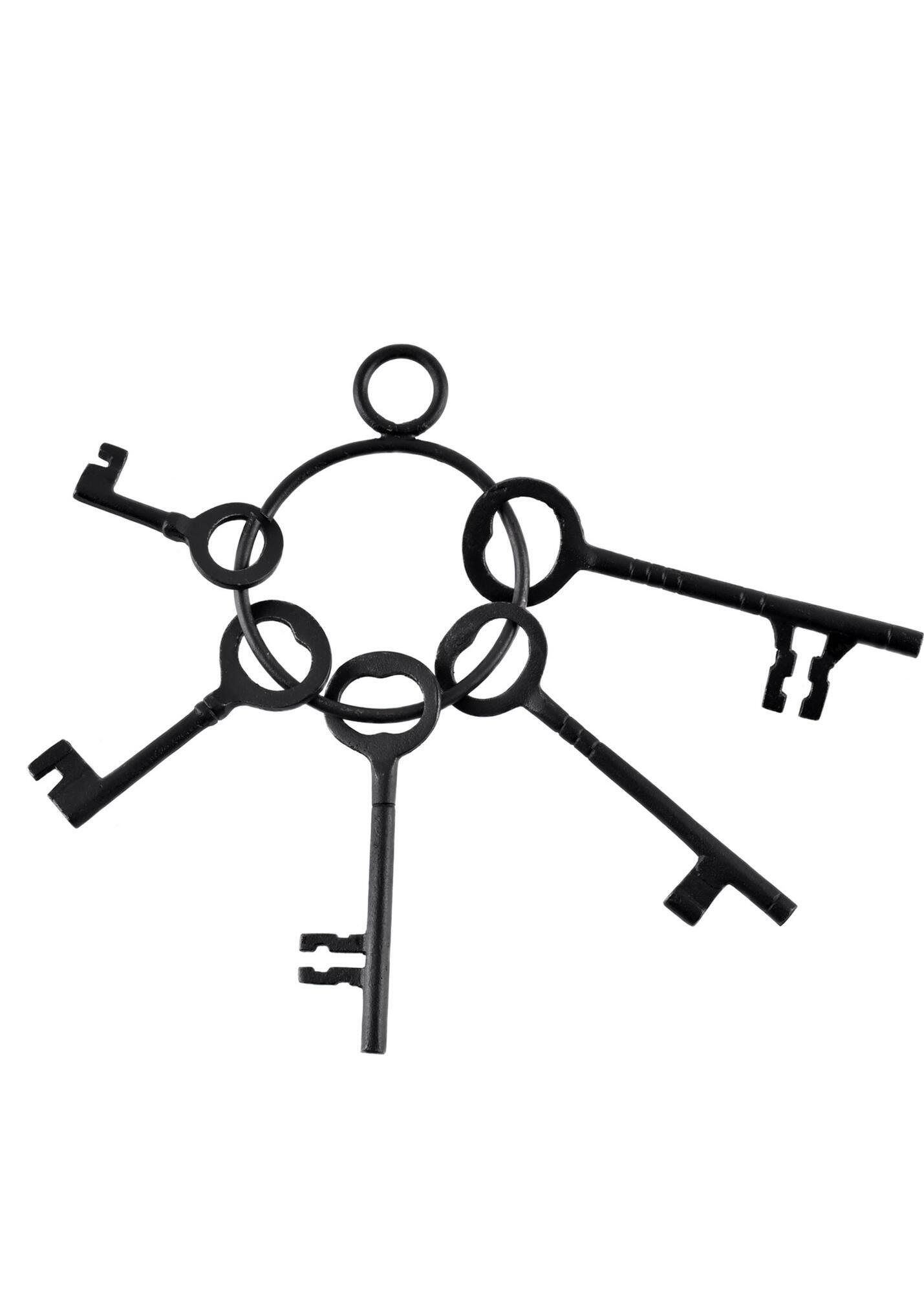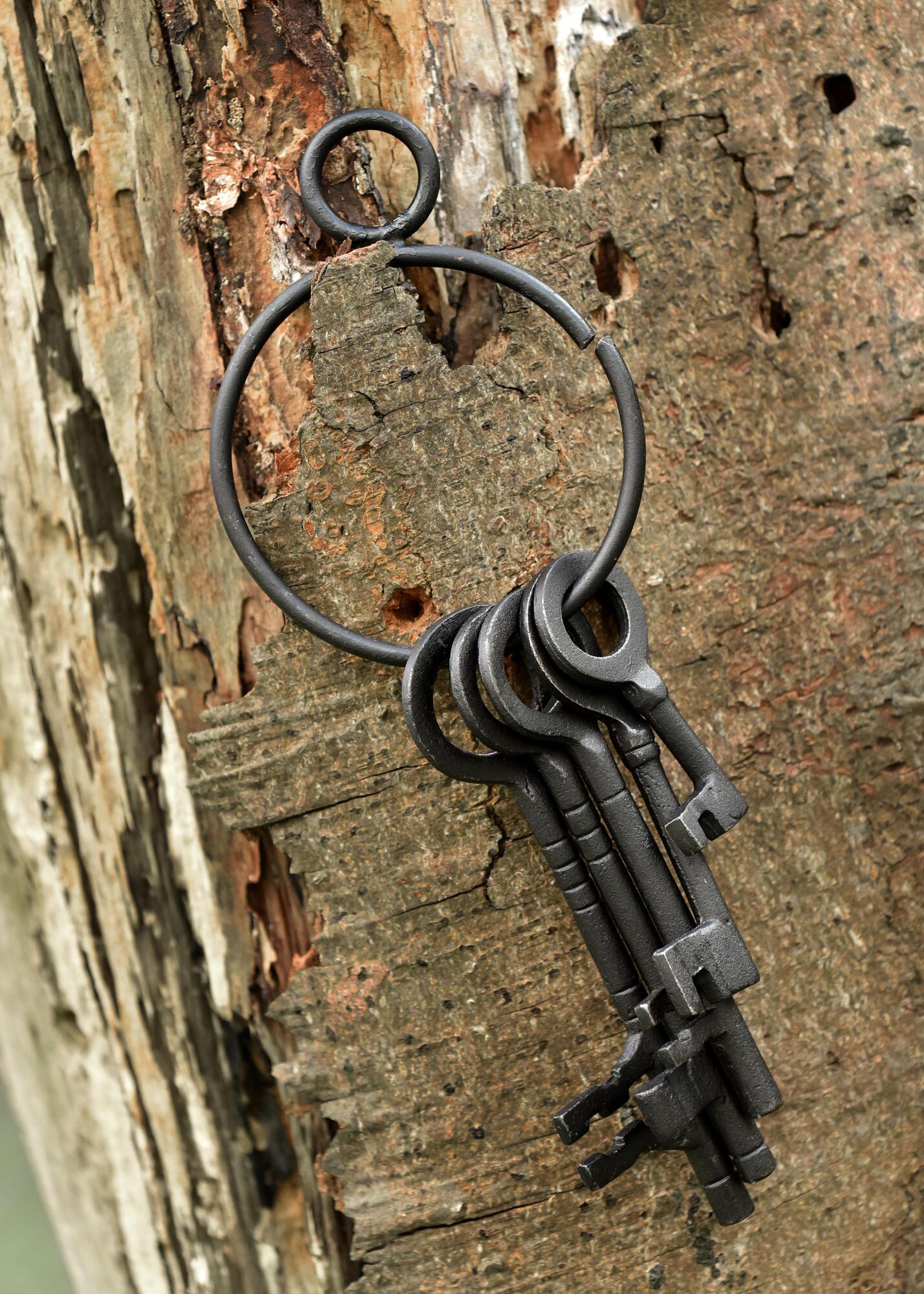 Sæt med fem nøgler i historisk stil samlet på en kraftig ring. Nøglerne har forskellige størrelser og et rustikt, gammelt udtryk, som giver et autentisk middelalderligt præg.