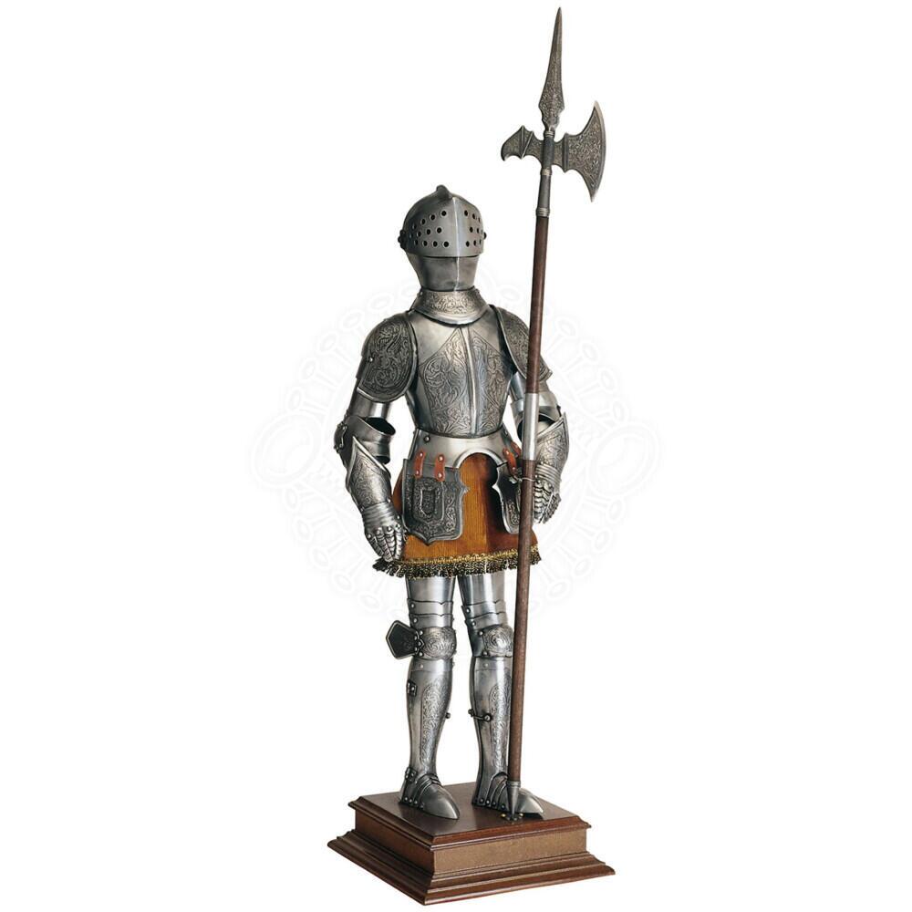 Hver eneste detalje på den 61 cm høje figur er udformet med fokus på historisk autenticitet. Rustningen er fremstillet i galvaniseret jernplade og dekoreret med fine ætsede mønstre, som efterligner de luksuriøse graveringer fra renæssancens mesterrustningsmagere.