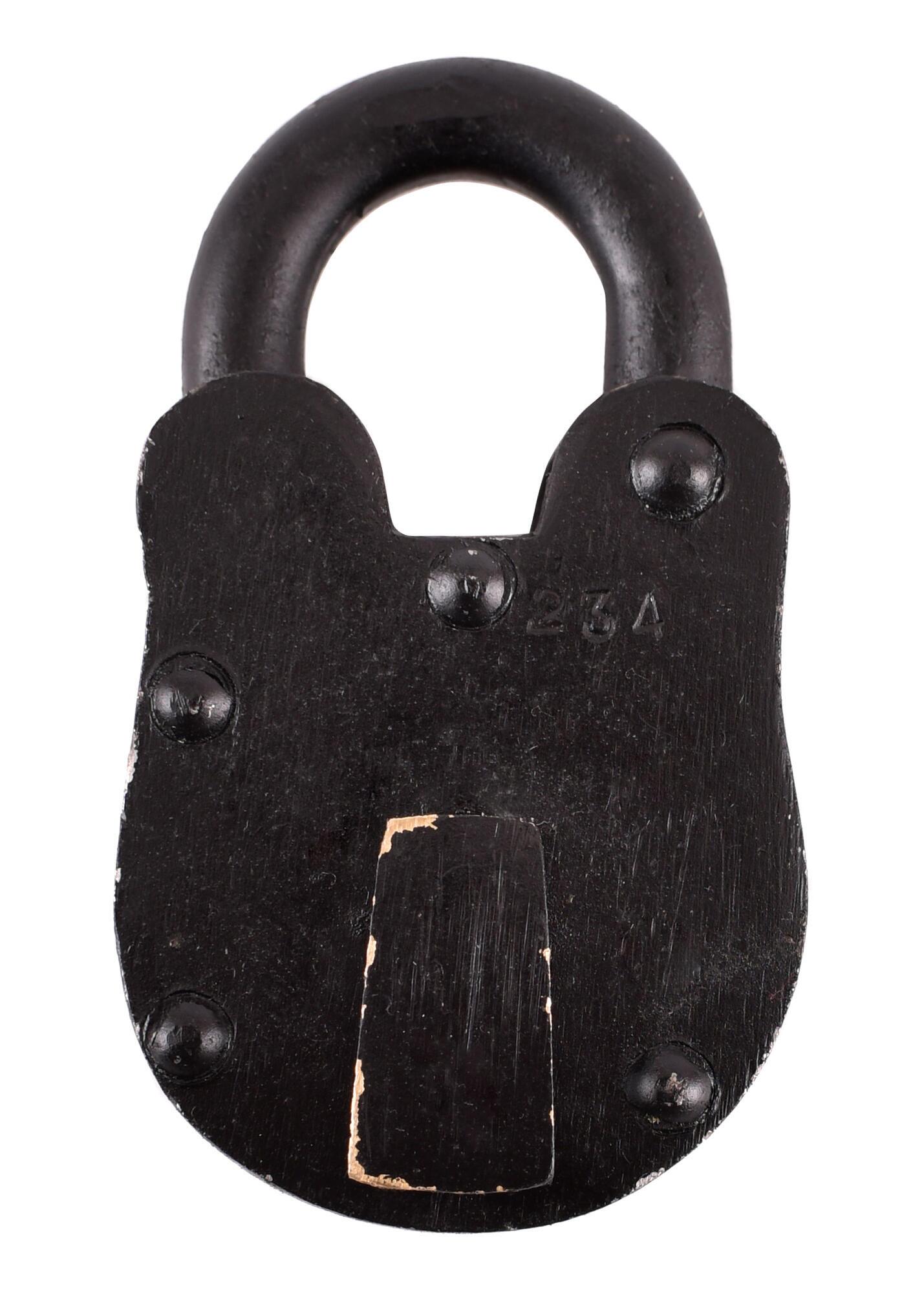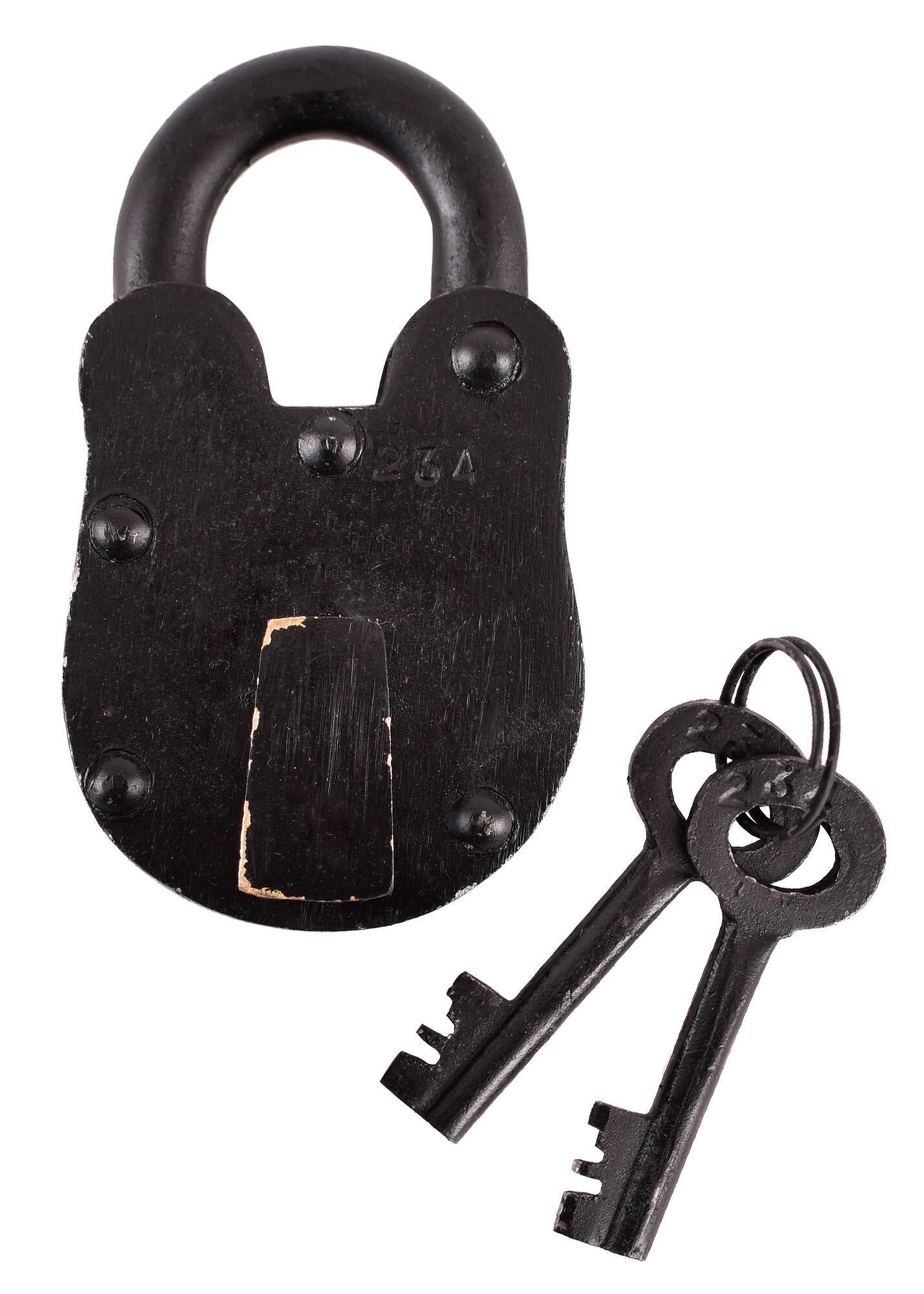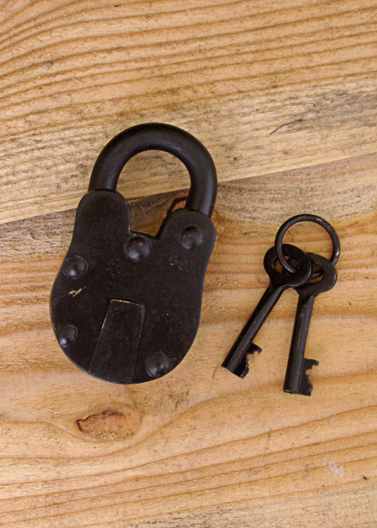 Solid og fuldt funktionel hængelås i klassisk historisk stil. Låsen er udstyret med nøglehulslåg og leveres med to stålnøgler.