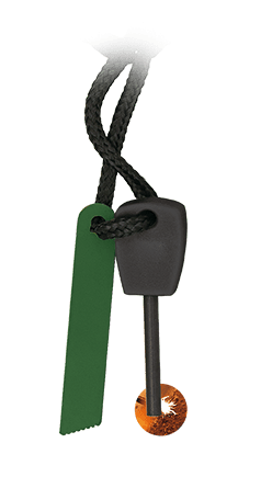 Firestarteren er fremstillet i magnesium, som giver stærke gnister og gør det nemt at tænde ild – selv i fugtige omgivelser.