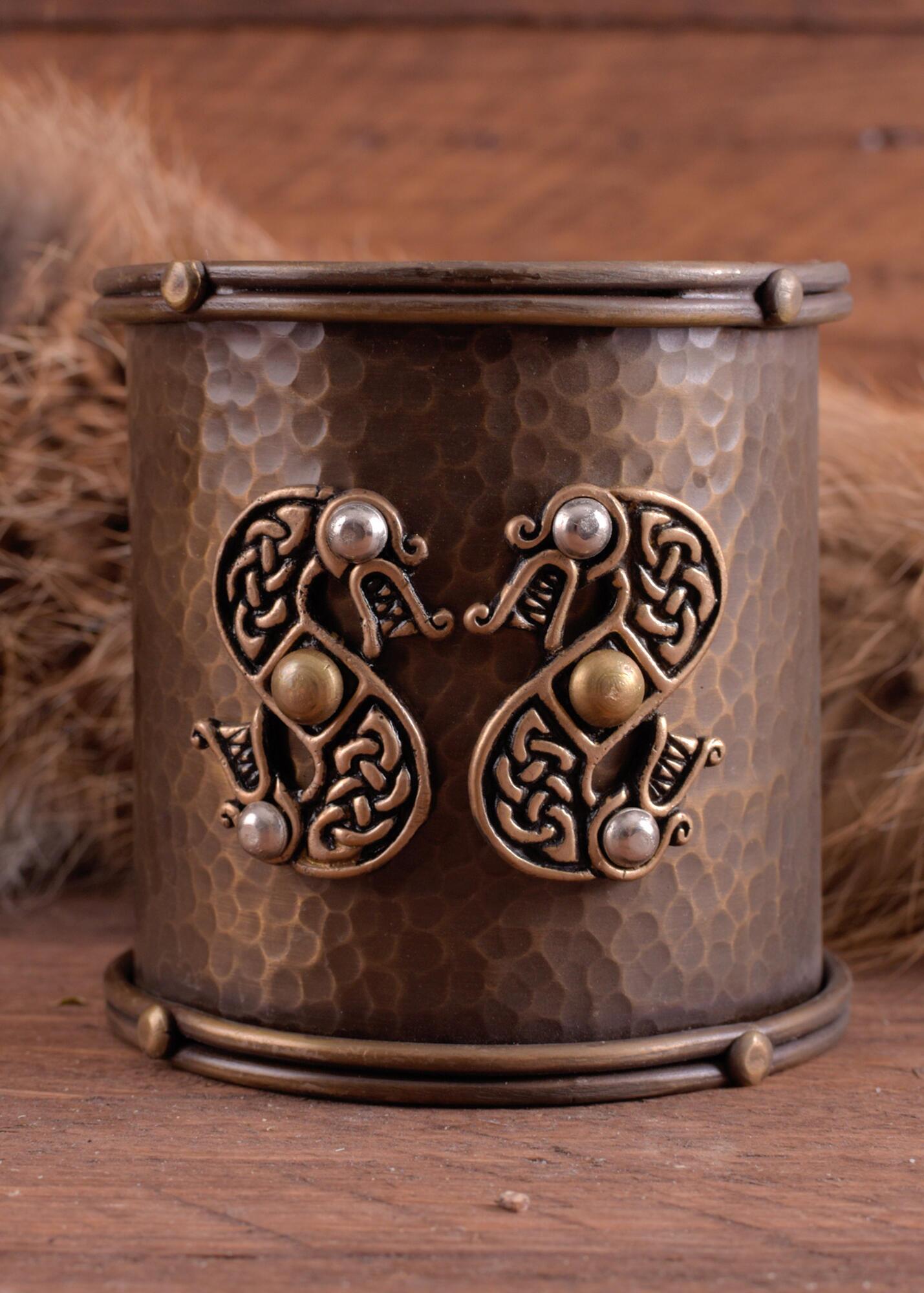 Denne markante armring er fremstillet i messing og har en rå, hammerbanket overflade, som giver smykket et rustikt og håndværkspræget udtryk. Midt på armbåndet sidder et dekorativt motiv af en dobbelthovedet slange udført i keltisk knudedesign.