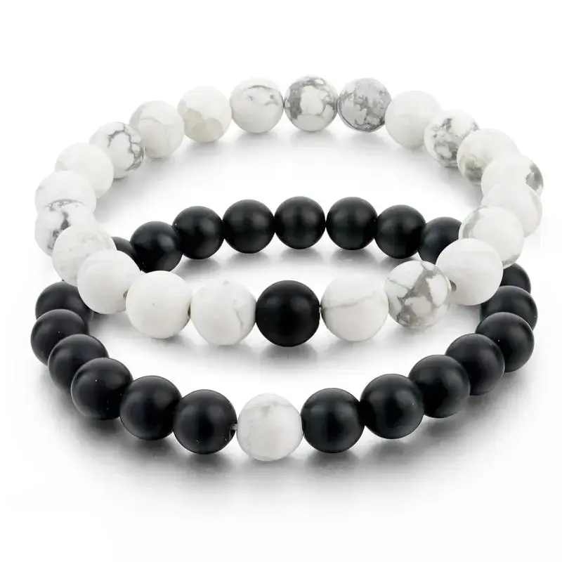 Sæt med to matchende Yin-Yang armbånd, der symboliserer balance og harmoni. Det ene armbånd består af sorte perler i lava-sten stil, mens det andet har hvide perler i marmor-stil, hvilket skaber den klassiske kontrast mellem Yin og Yang.