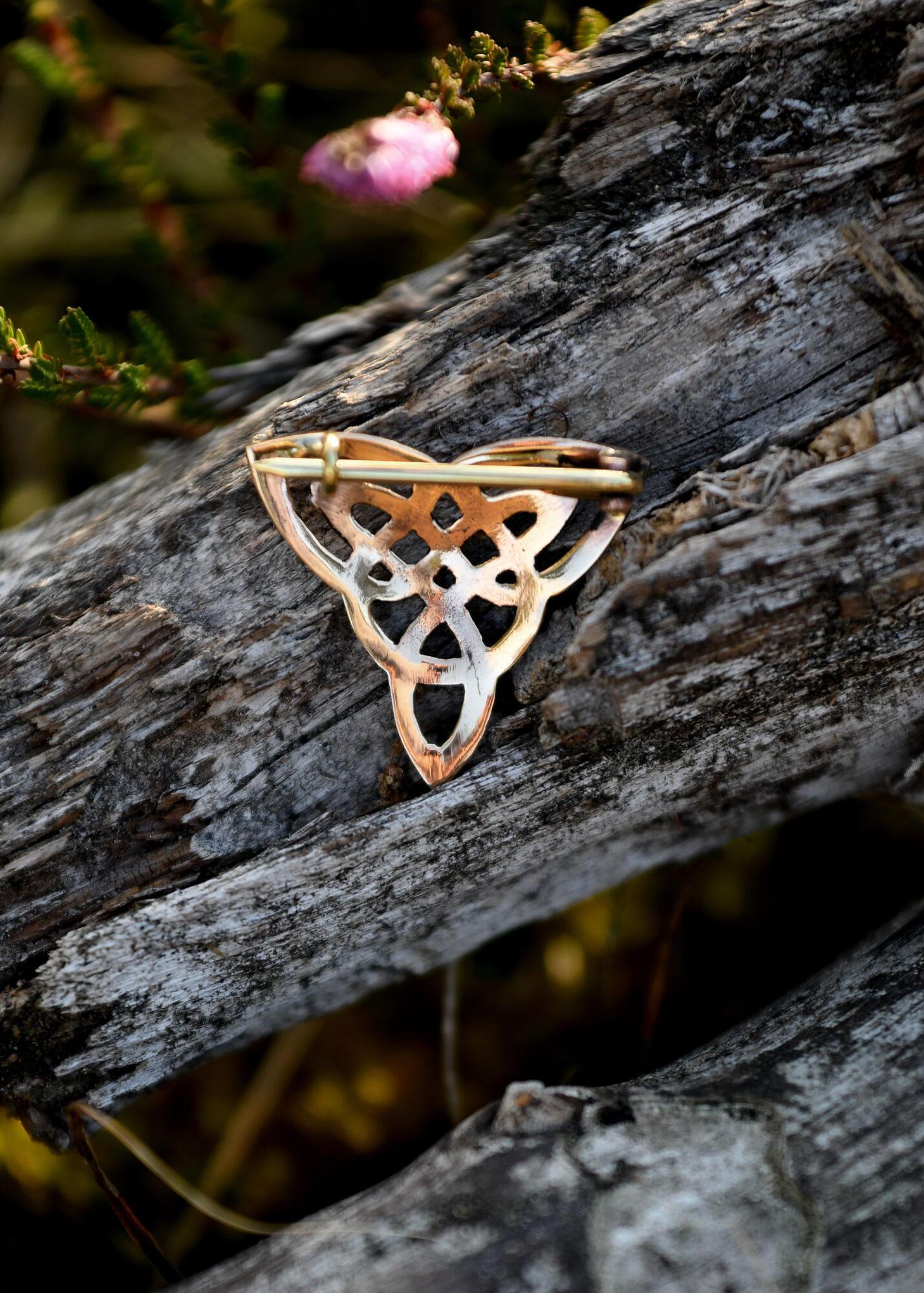 Denne dekorative fibula er udsmykket med den klassiske triquetra, også kendt som treenighedsknuden eller det keltiske trekantsmotiv. Symbolet består af tre sammenflettede buer, der danner en trekant uden begyndelse eller ende – et motiv der ofte forbindes med evighed, sammenhæng og livets cyklus.