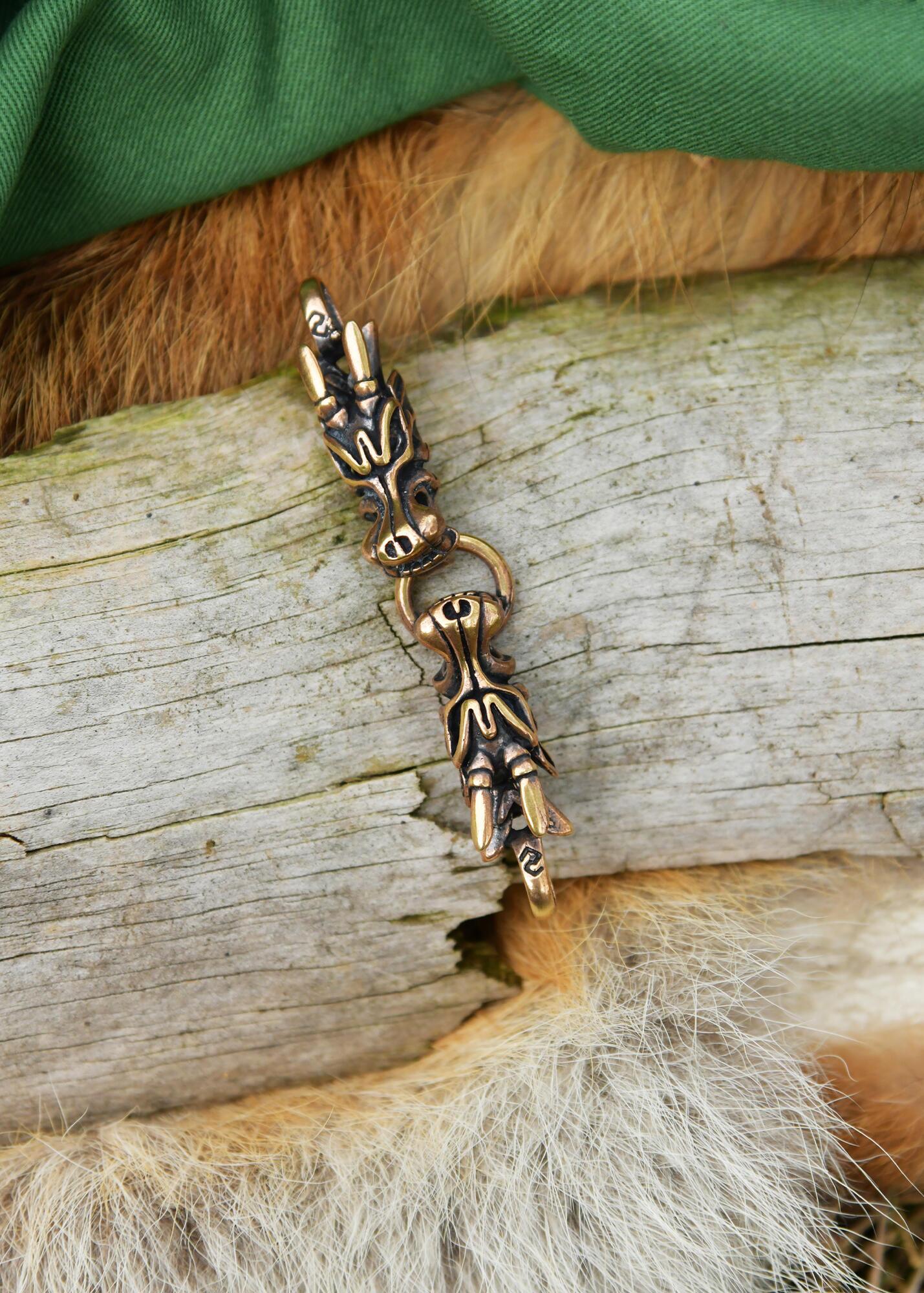 Dette karakterfulde kappespænde er udformet med to detaljerede dragehoveder, inspireret af vikingetidens dyreornamentik. Dragermotiver var almindelige i nordisk kunst og blev ofte forbundet med styrke, beskyttelse og magt.