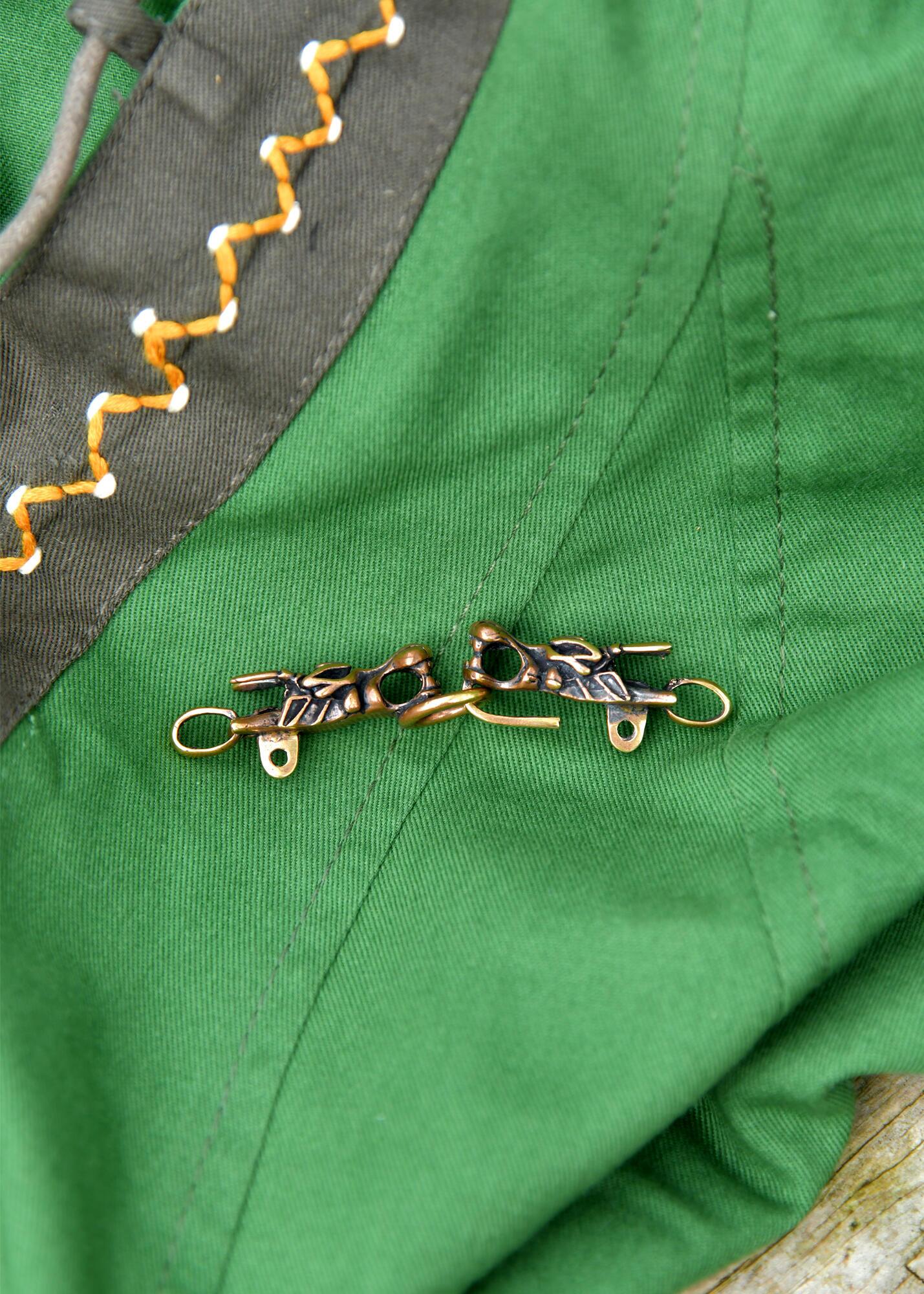 Kappespændet er fremstillet i bronze og har et robust design, der passer godt til vikinge- og middelalderinspireret påklædning, reenactment eller historiske arrangementer.