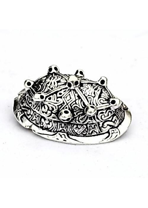 Denne model er fremstillet i bronze og findes også i en forsølvet udgave. På bagsiden sidder en solid nål og et ophæng, som sikrer en stabil fastgørelse til tøjet.