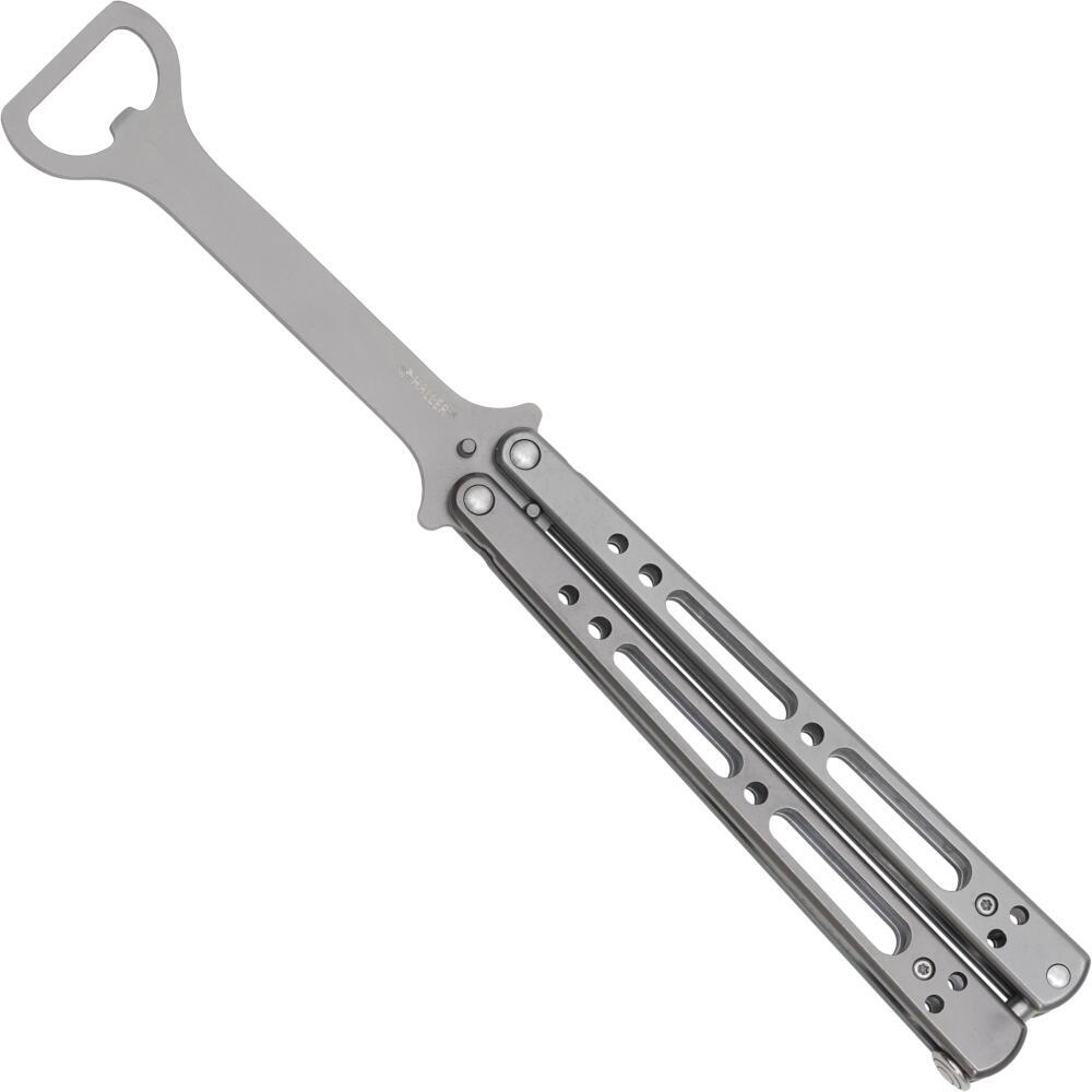 Denne Butterfly oplukker kombinerer træningskniv og flaskeåbner i ét stilrent design. Titanium Finish