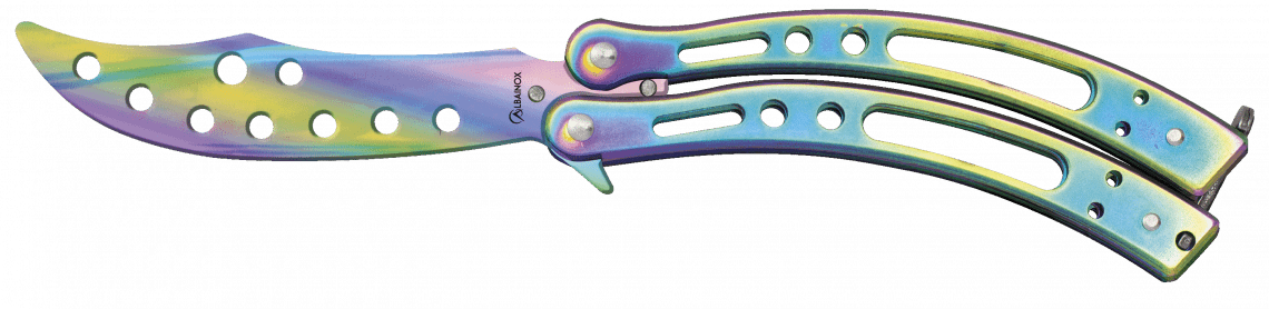 En iøjnefaldende trænings-balisong med flot rainbow-finish, der giver et unikt og levende udtryk. Perfekt til dig, der vil træne tricks og bevægelser med både stil og sikkerhed.