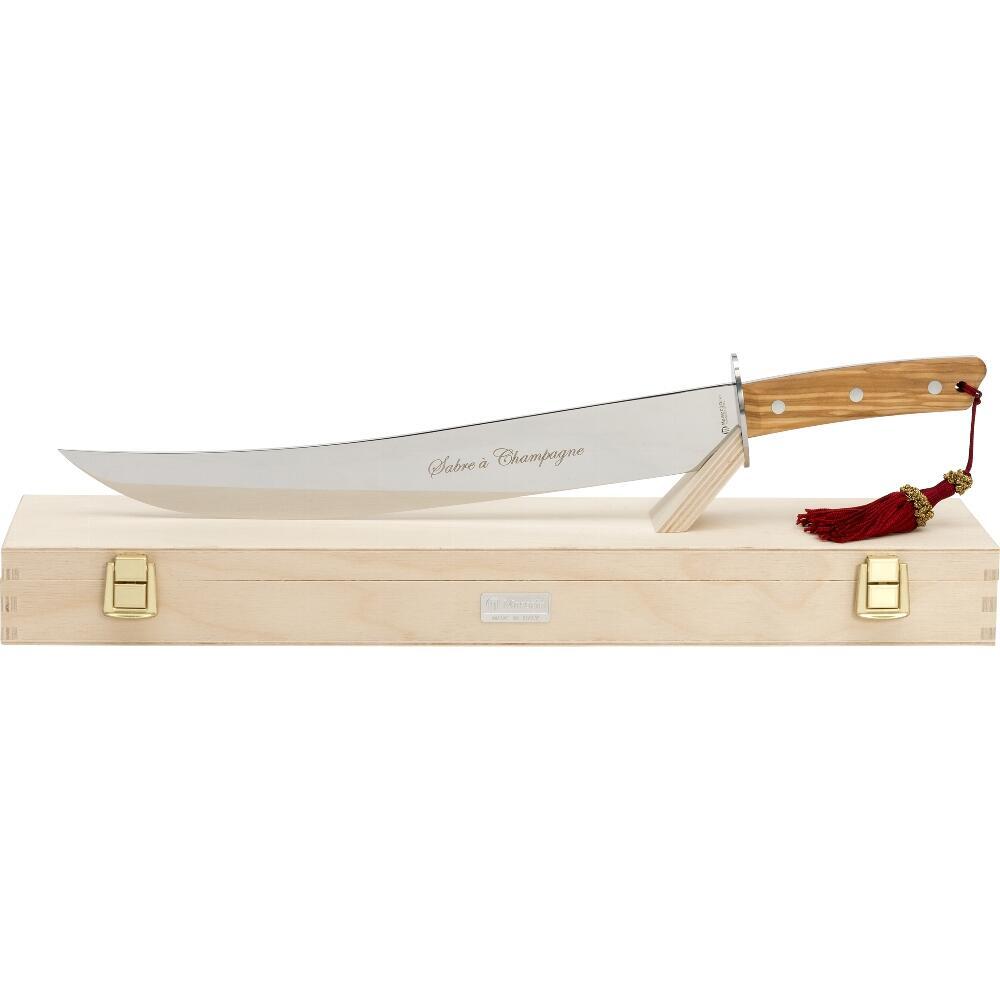 Håndtaget i ægte oliventræ tilfører et varmt og eksklusivt udtryk med naturlige åretegninger, der gør hver sabel unik. Sabelen leveres i en fornem trææske, hvilket gør den oplagt som gave til særlige lejligheder såsom bryllupper, jubilæer eller festlige begivenheder.