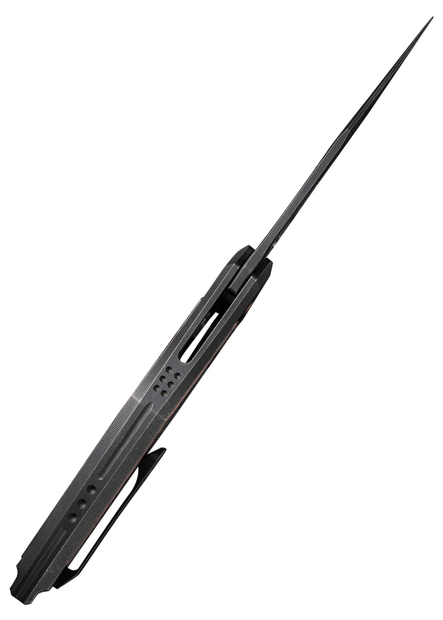 Orpheus Titanium Copper Foil CF er en eksklusiv og iøjnefaldende foldekniv fra We Knife, skabt til entusiaster og samlere, der ønsker noget helt særligt. Designet kombinerer klassisk Bowie-inspiration med moderne materialer og kompromisløs forarbejdning.