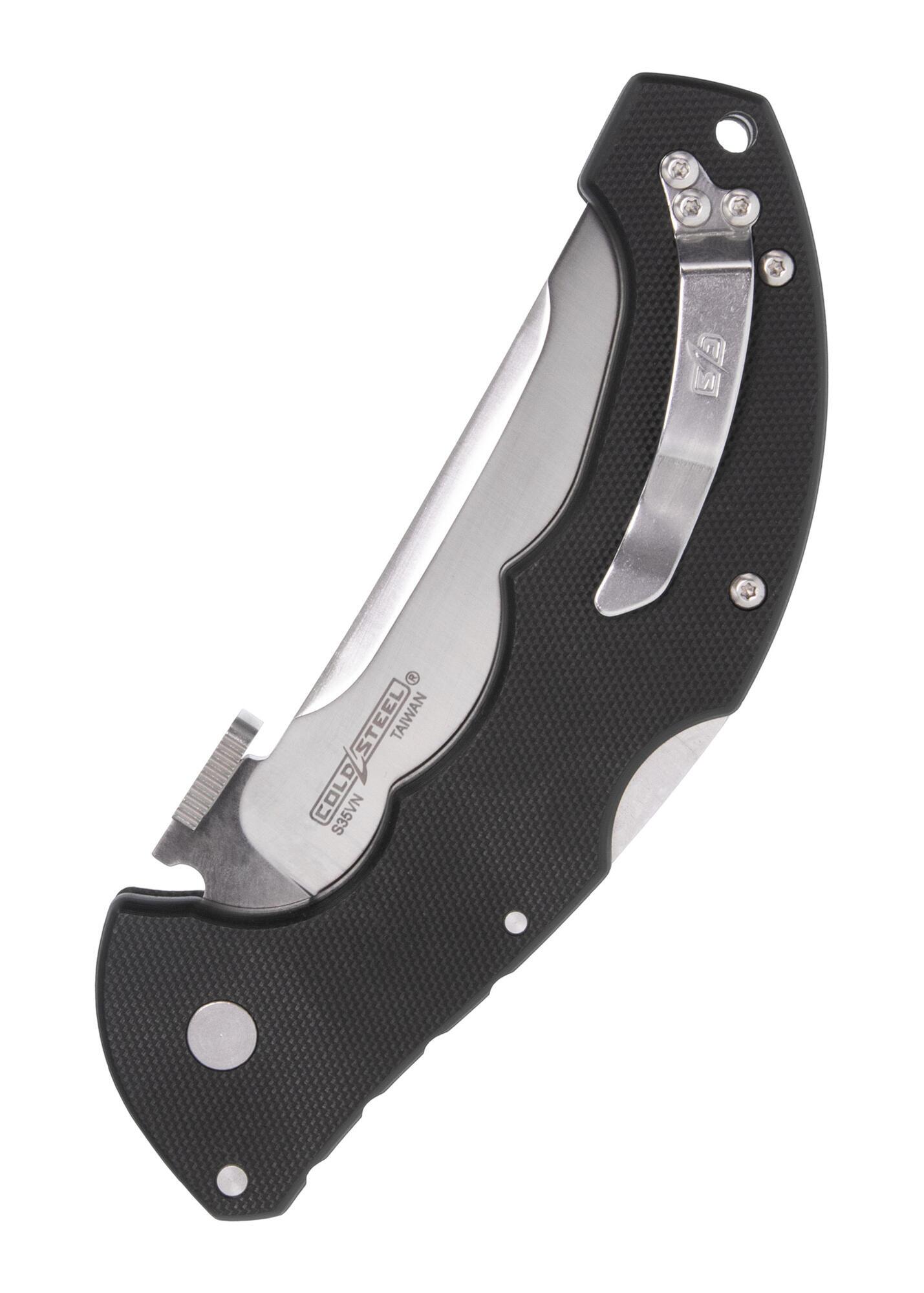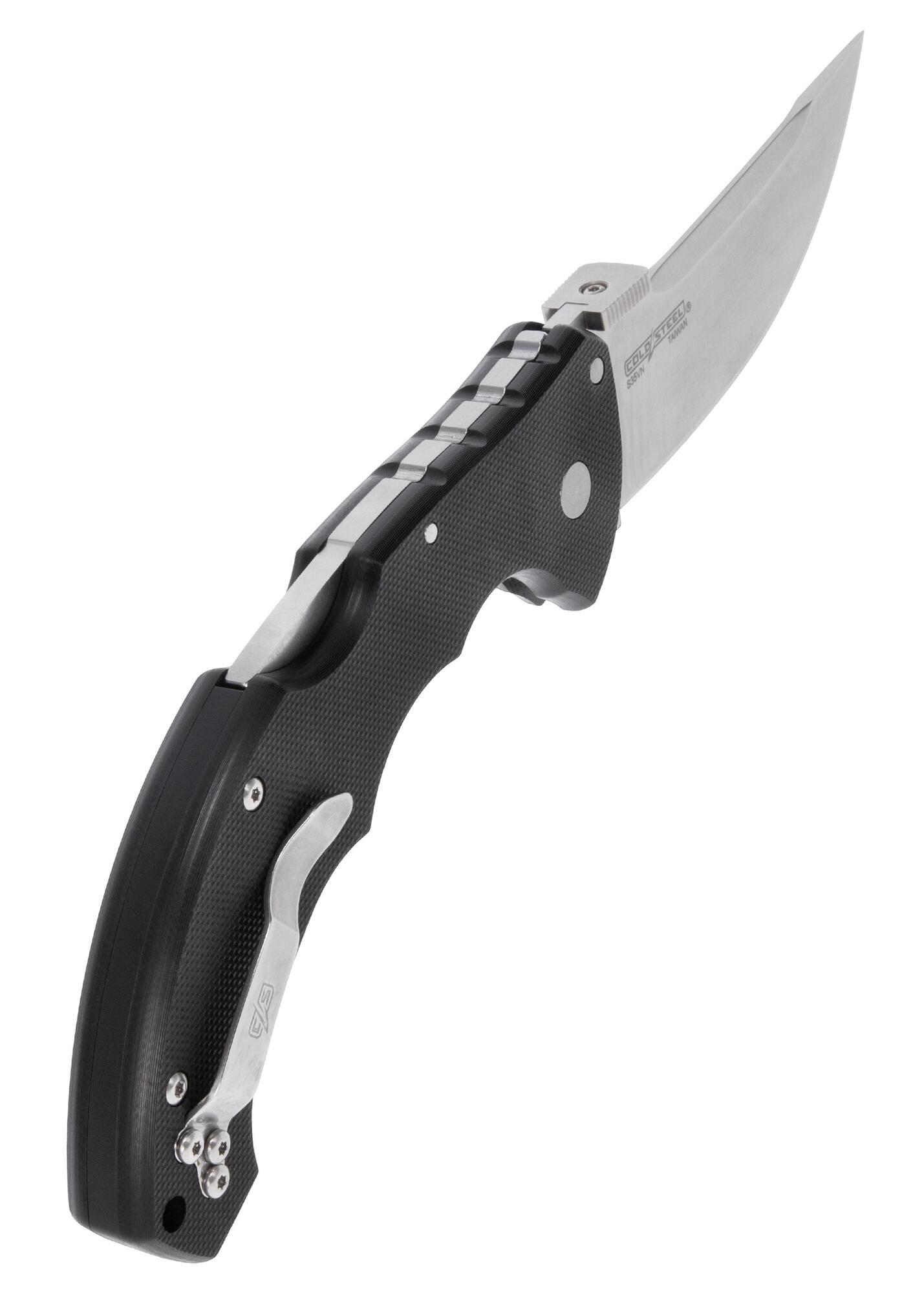 Håndtaget er fremstillet i amerikansk G-10 med en tekstureret, ergonomisk pistolgrebsform. De integrerede fingerfordybninger giver både komfort og maksimal kontrol under brug. For ekstra sikkerhed er kniven udstyret med Cold Steels anerkendte Tri-Ad® låsemekanisme – kendt som en af de stærkeste og mest pålidelige låse på markedet.