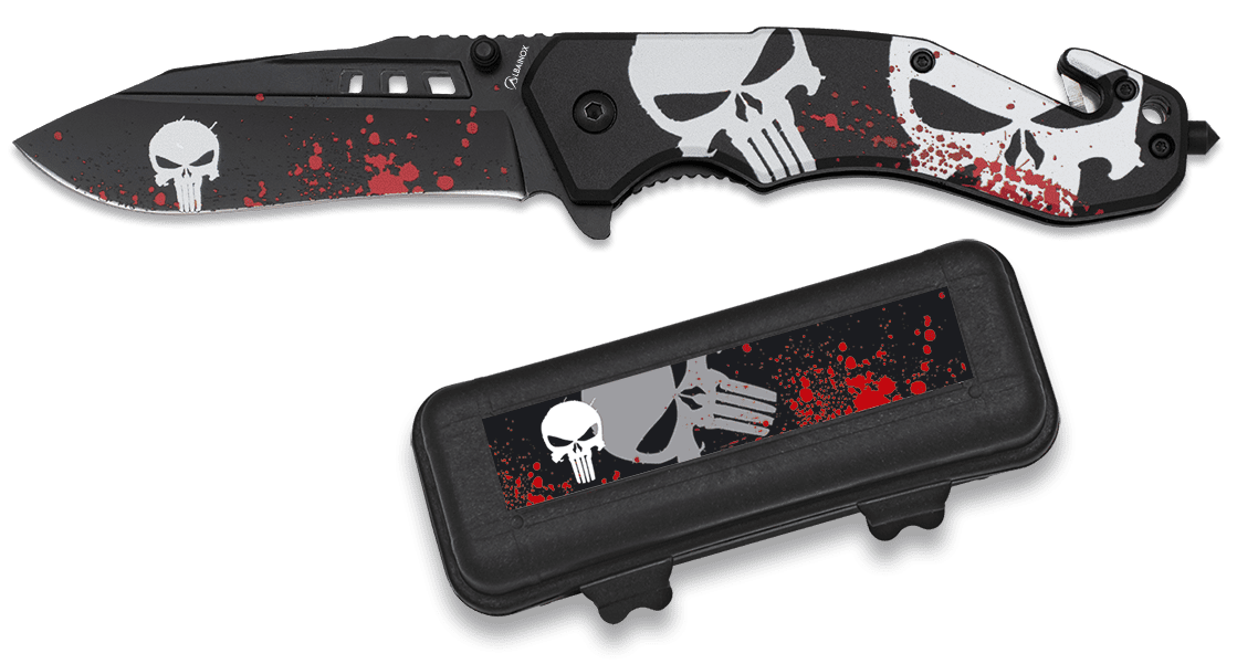 Denne taktiske foldekniv kombinerer et råt skull-design med praktiske funktioner, der gør den velegnet til både hverdag og nødsituationer. Et stærkt valg til dig, der ønsker mere end bare en almindelig kniv.