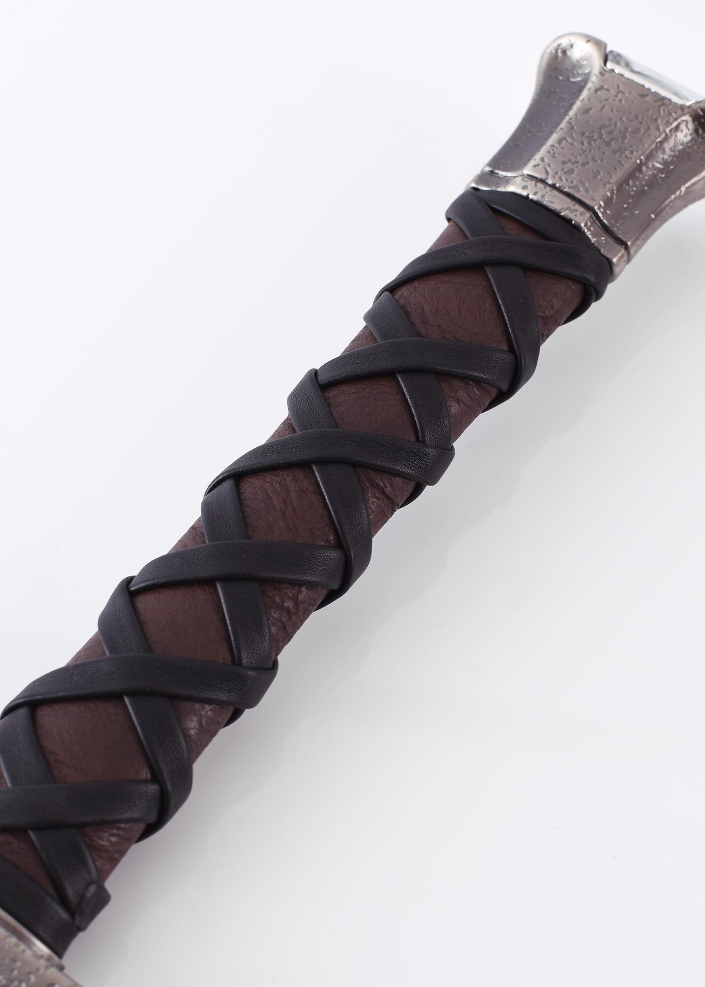 Klingen er udført i rustfrit stål, mens fæstet består af støbte metaldele med læderomviklet greb, der giver et autentisk og eksklusivt udtryk.