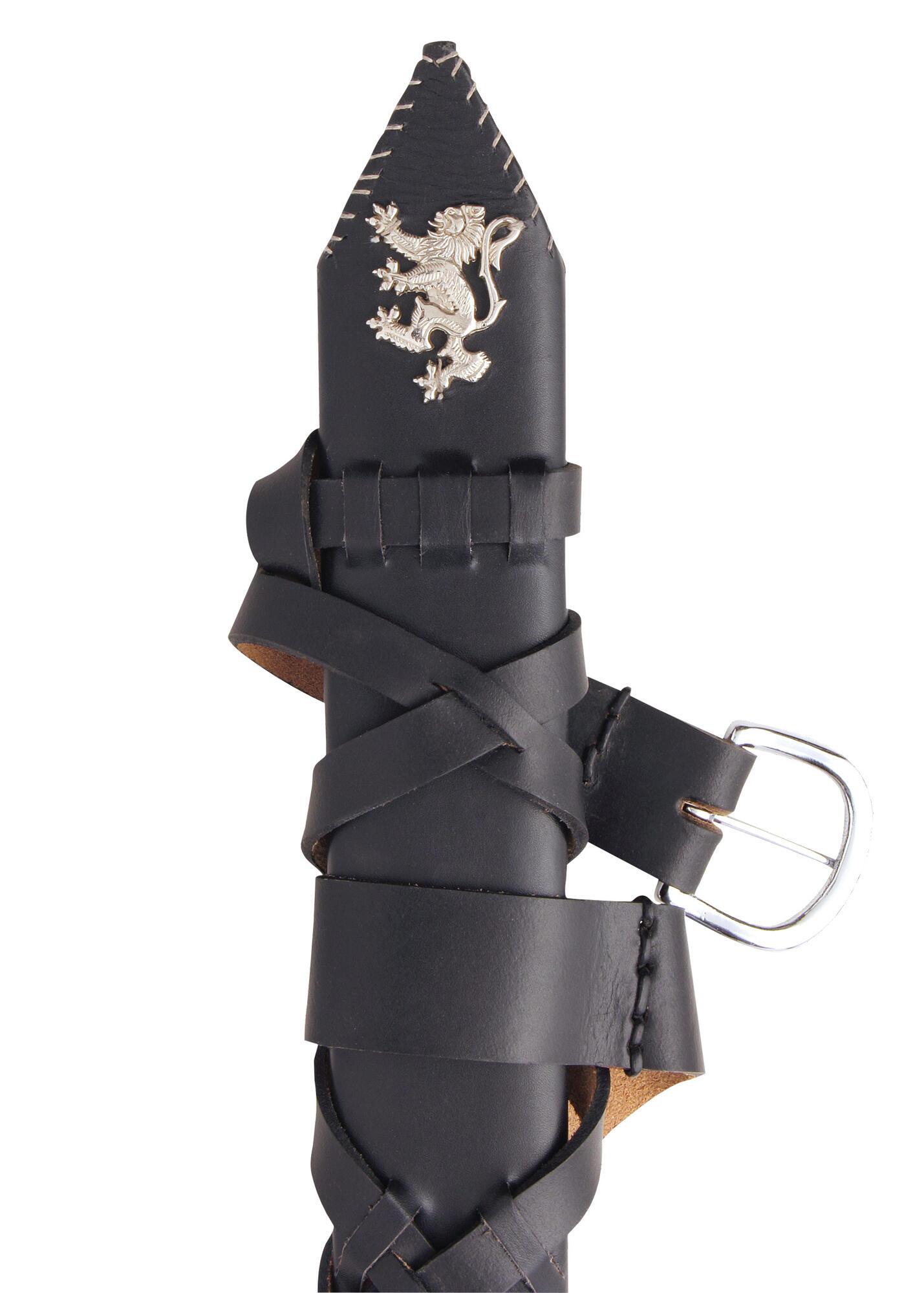 Sværdet leveres med en kraftig sort læderskede, udsmykket med Skotlands løve i sølvfinish ved mundingen samt metalforstærkning i spidsen. Et praktisk sort læderbælte er fastgjort til skeden for nem bæring.
