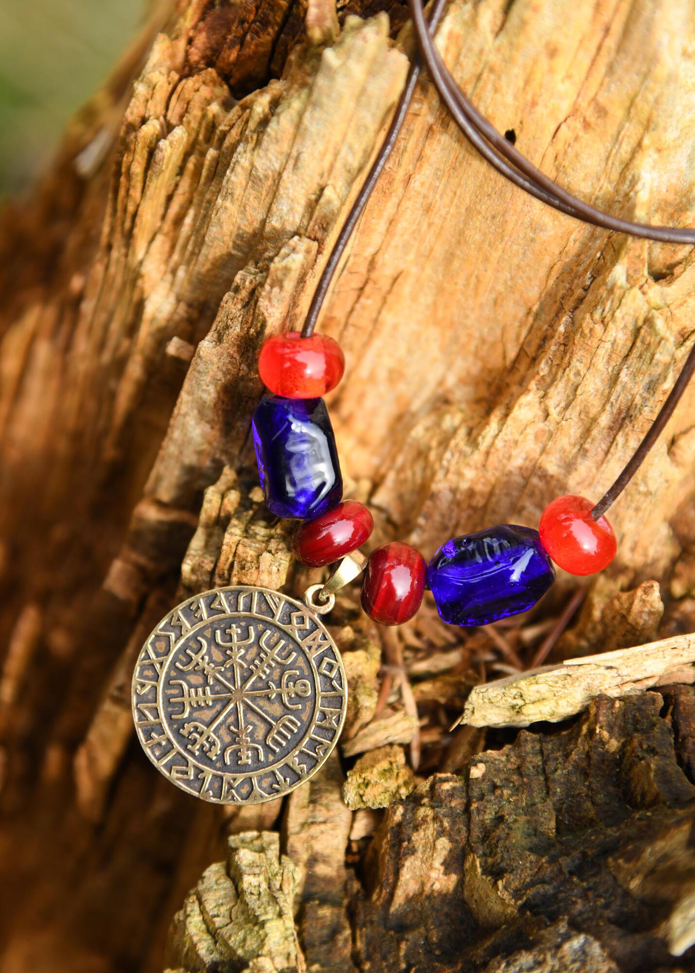 Vikingesmykke med bronzefarvet Vegvisir-vedhæng og håndlavede glasperler