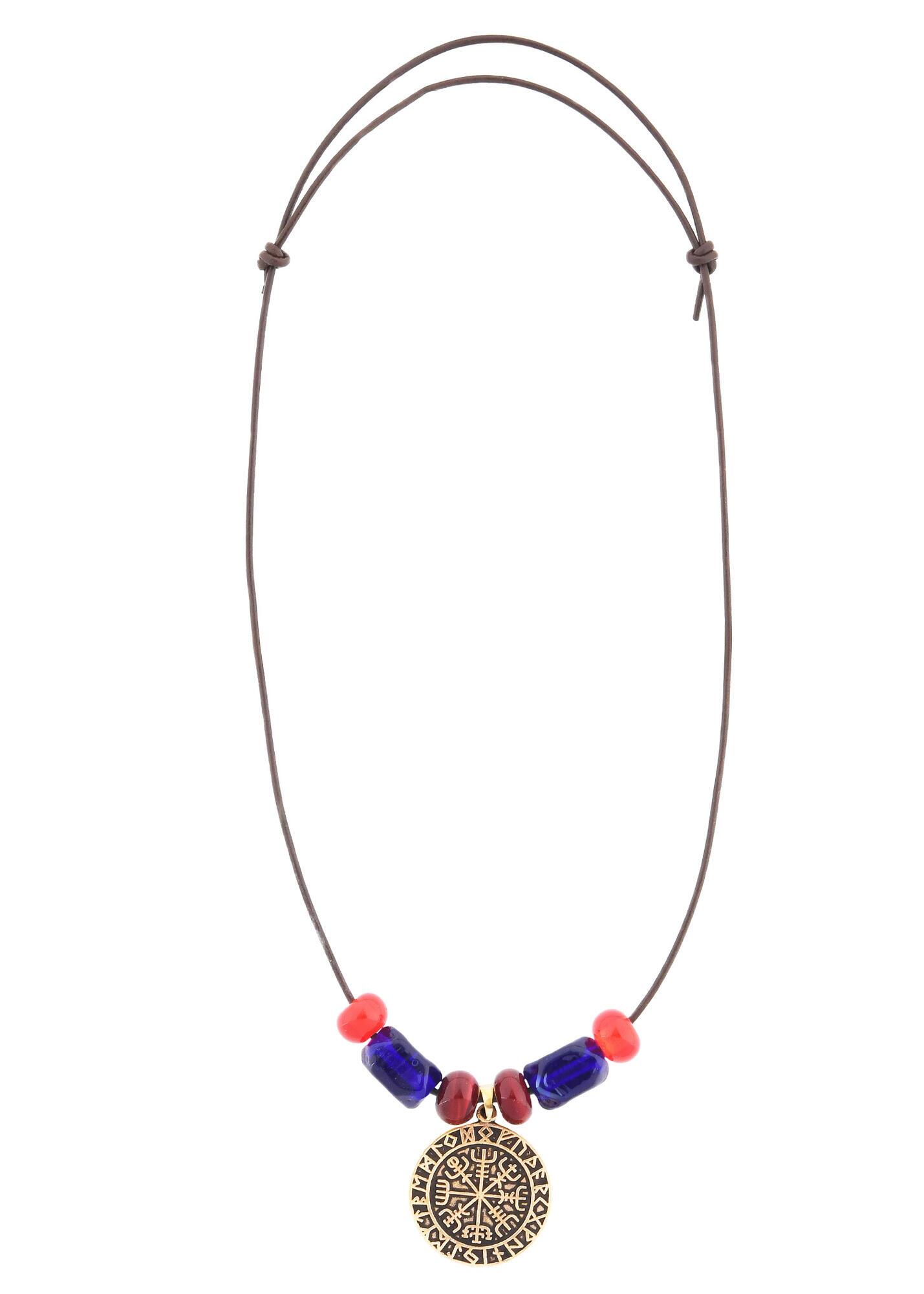 Denne flotte halskæde kombinerer farverige glasperler med et dekorativt Vegvisir-vedhæng i bronze. Smykket er inspireret af vikingetidens stil og giver et karakterfuldt og historisk inspireret udtryk.
