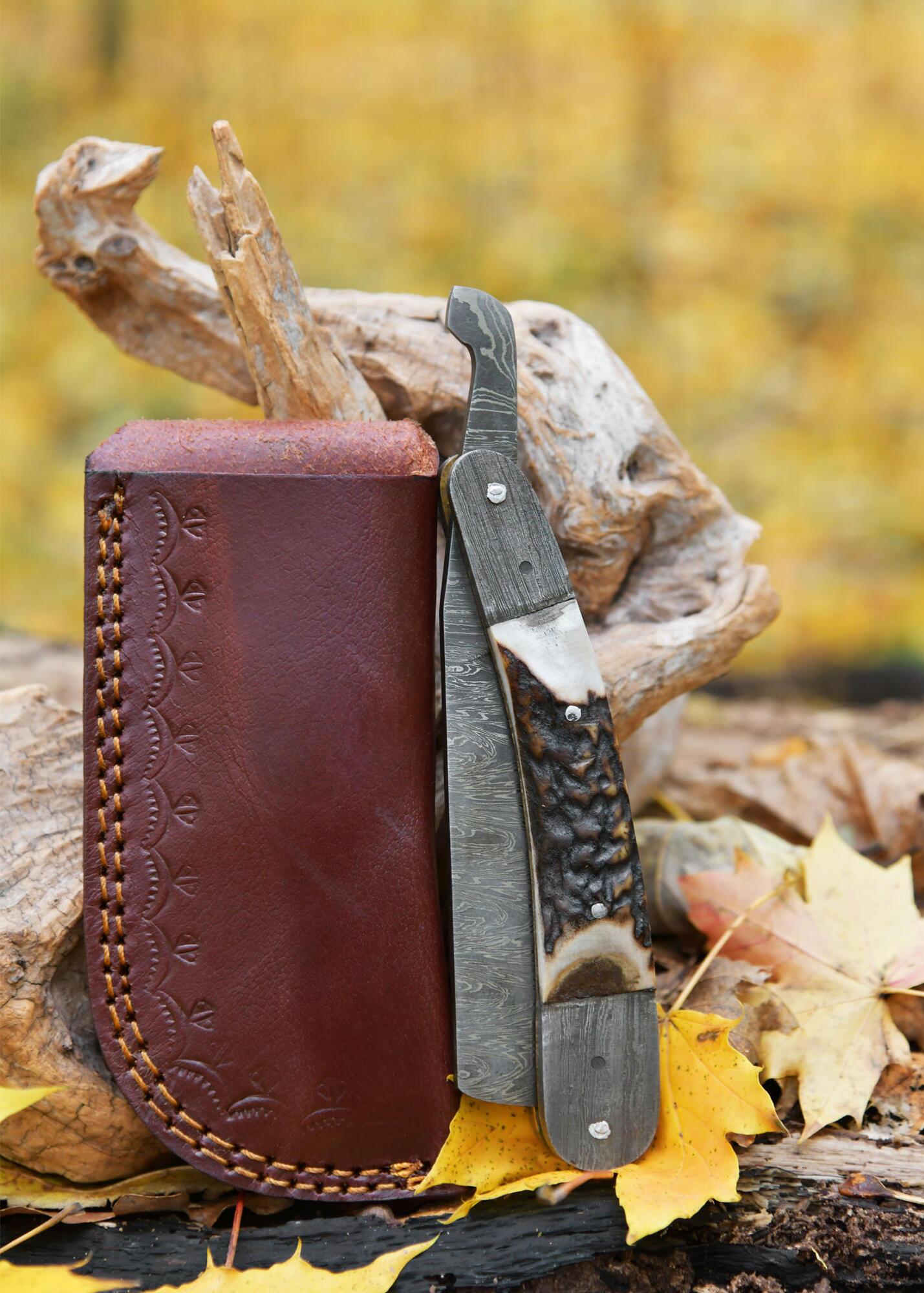 Damaskusbarberkniv med hjortehornsskæfte og læderskede – Dekorationsgenstand