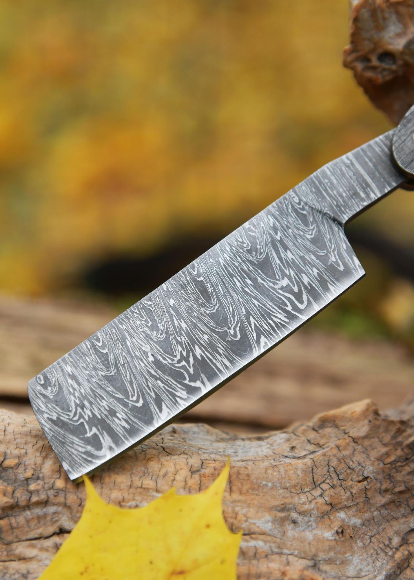 Håndlavet barberkniv i klassisk, foldbart design med klinge smedet i ægte damaskusstål (144 lag). Skæfterne er fremstillet i ægte hjortehorn, hvilket giver et rustikt og eksklusivt udtryk. Der medfølger en enkel læderskede, så genstanden kan bæres i bæltet eller opbevares sikkert.