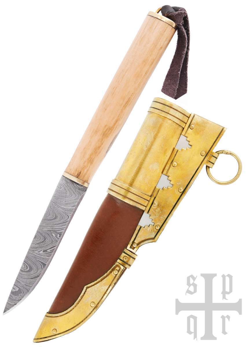 Kniven leveres med en smukt garvet læderskede med dekorative messingbeslag. Den integrerede ophængsring gør det muligt at bære kniven komfortabelt i bæltet – i autentisk vikingestil.