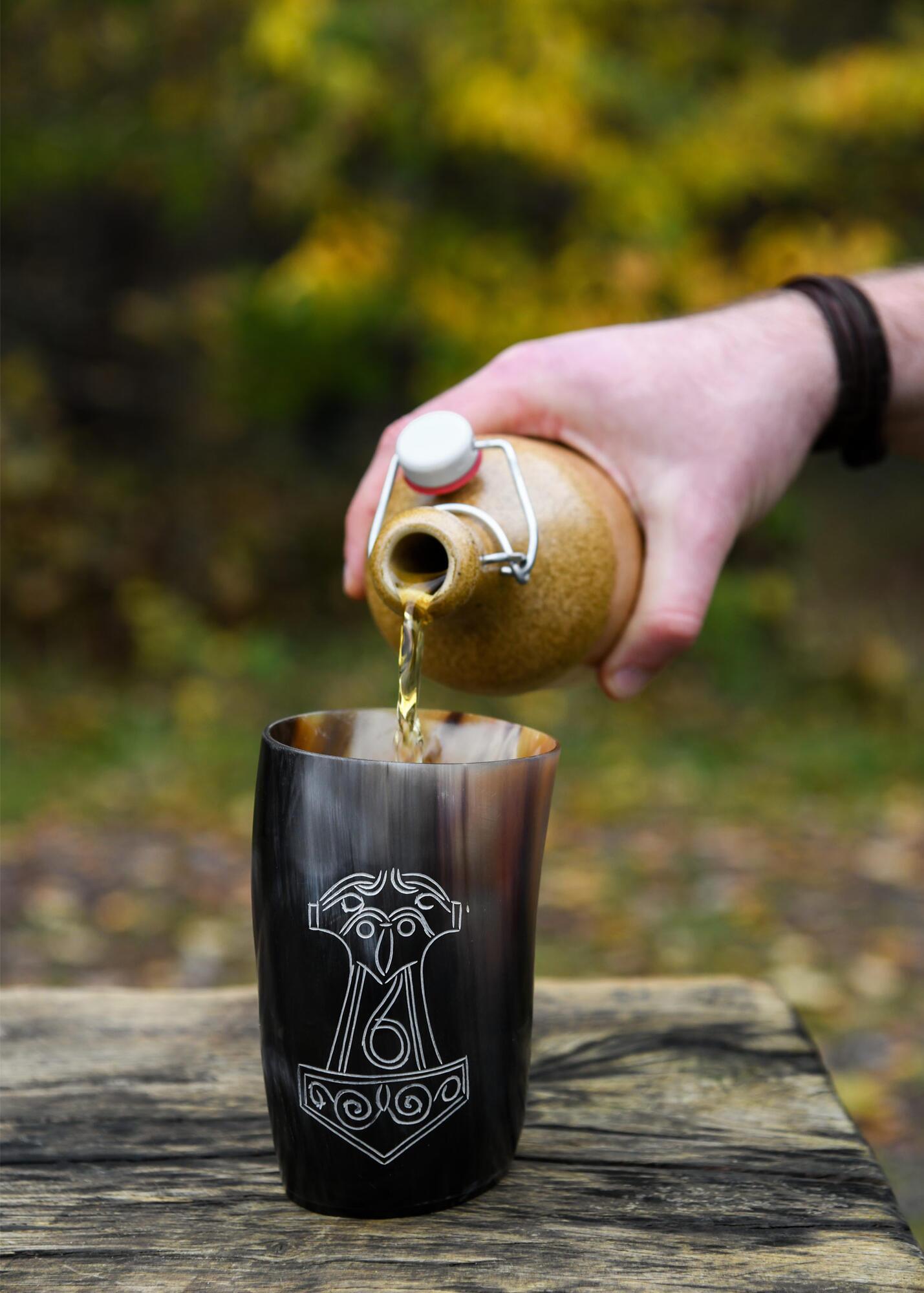 Drikkekoppen er ikke kun dekorativ – den kan også bruges til dine foretrukne drikke. Indersiden er forseglet med en fødevaregodkendt lak, så koppen er velegnet til eksempelvis øl eller mjød. Den naturlige hornstruktur giver hvert eksemplar sit eget unikke udseende.