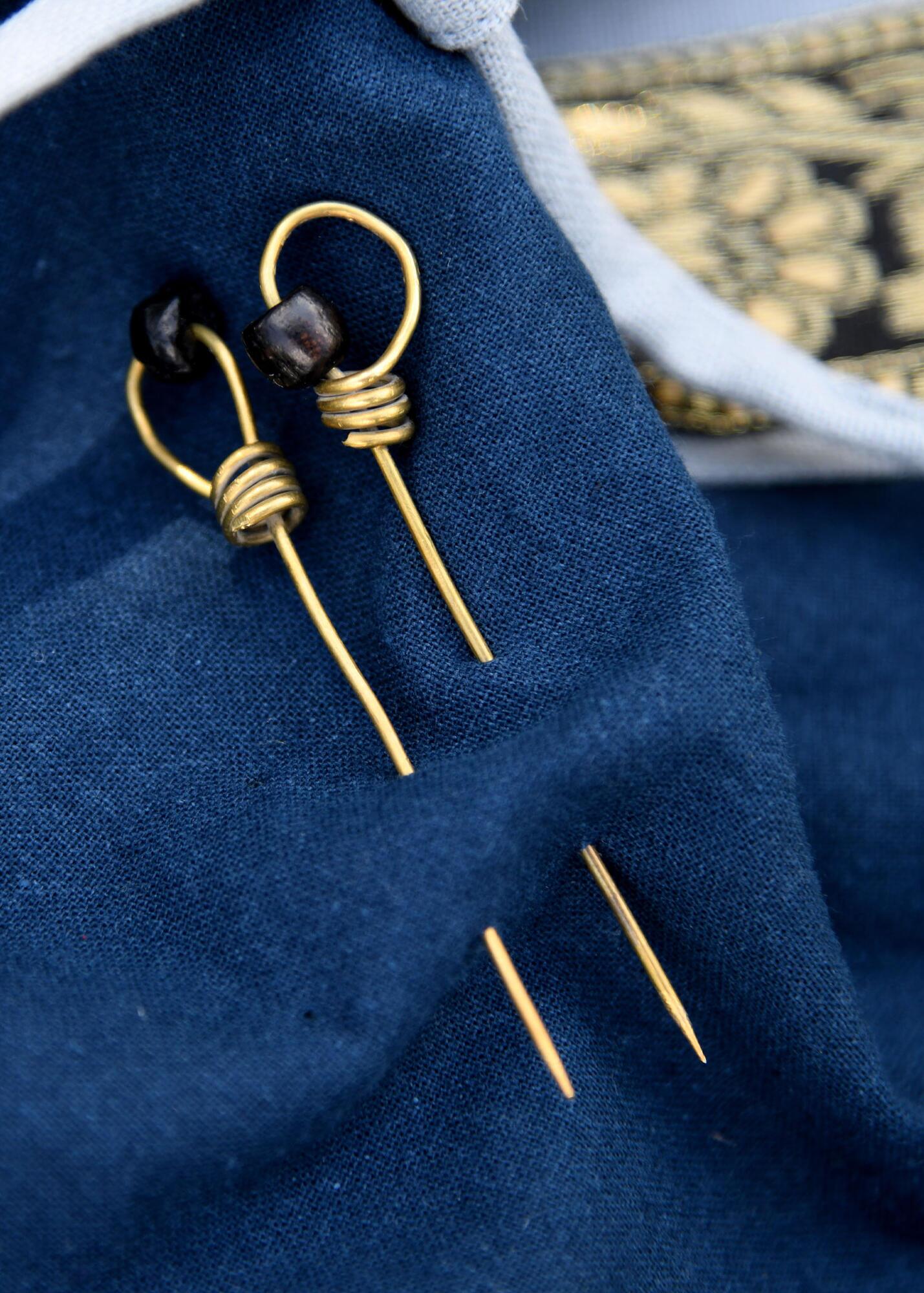 Nålene er håndlavet af messingtråd og spidset til, så de let kan føres gennem stof. Messingen er tilpas fleksibel til, at nålens hoved kan drejes, men samtidig stærk nok til at holde sikkert i tøjet.