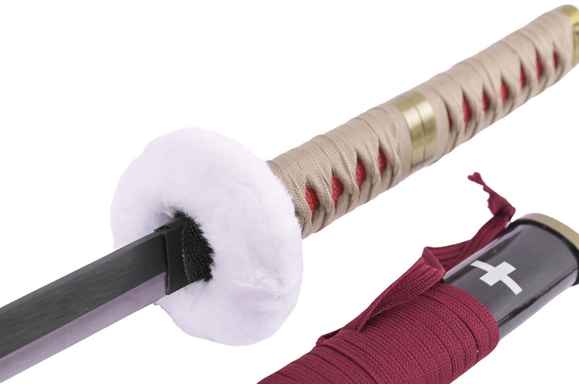 - Tsuba: Rund med hvid pels (diameter 9 cm)