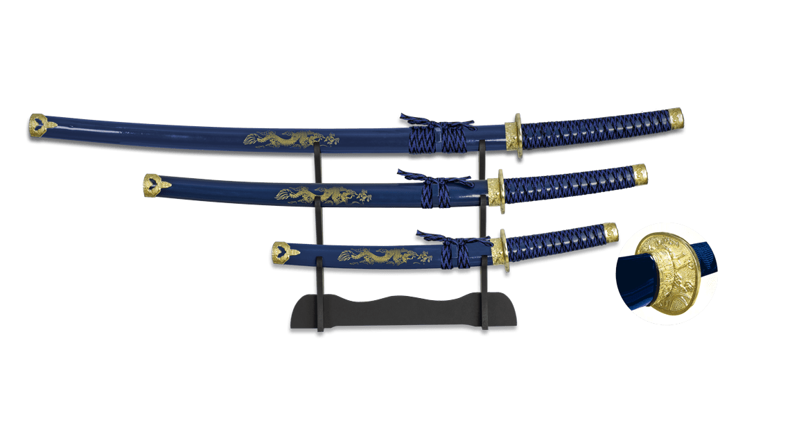 Dette katana sæt består af tre sværd i forskellige størrelser, som tilsammen skaber en flot og harmonisk præsentation. De blå detaljer giver sættet et friskt og iøjnefaldende udtryk, der skiller sig ud i enhver samling.