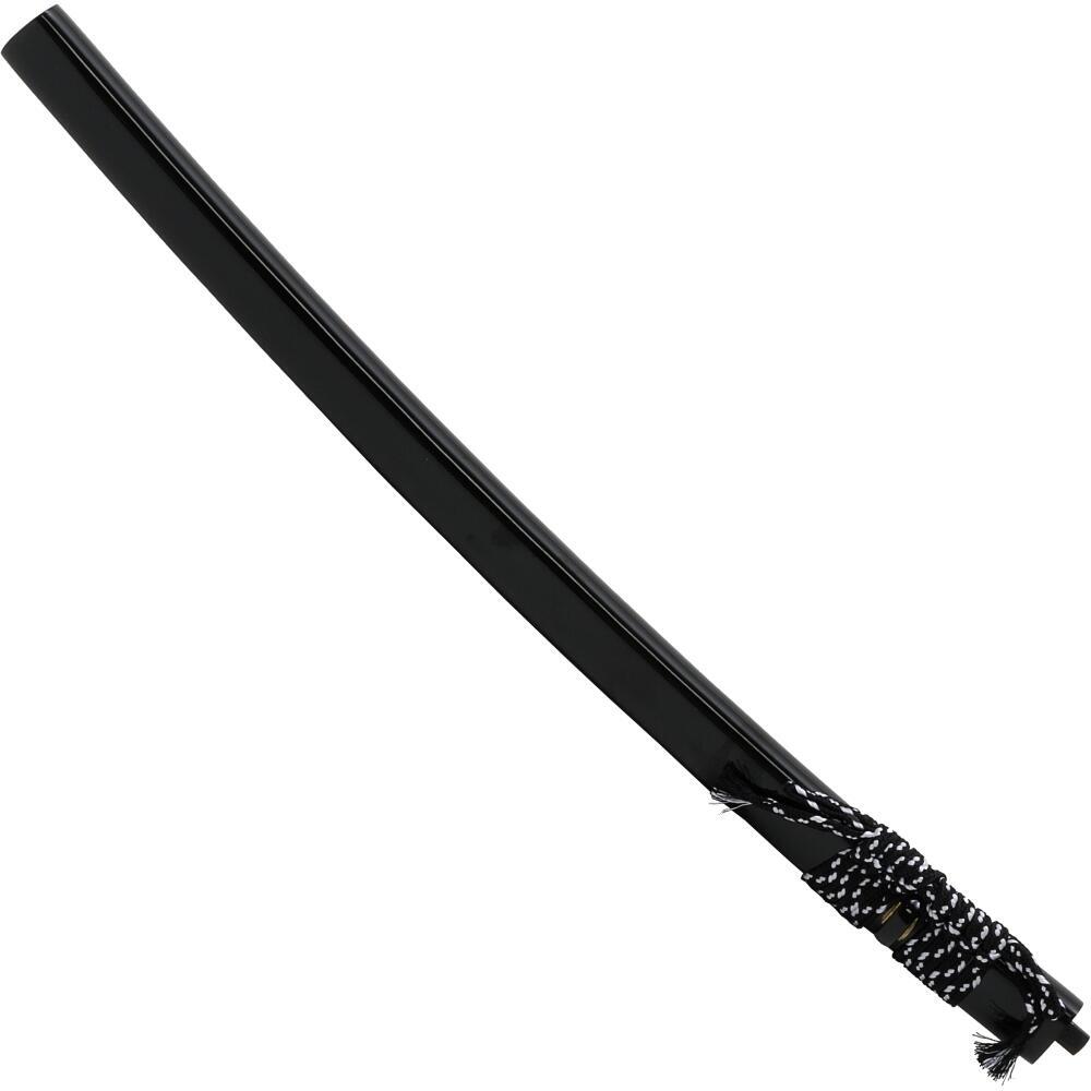 Håndtaget (tsuka) er i træ med ægte rokkehud og omviklet i bordeaux silke i traditionel Hineri Maki stil. Skeden (saya) er sort, spejlpoleret træ i Kuroro-stil og indeholder en kozuka – en lille hjælpeklinge integreret i skeden, hvilket gør sværdet ekstra unikt. Modellen er fremstillet efter historiske forbilleder og leveres i en flot samleræske.
