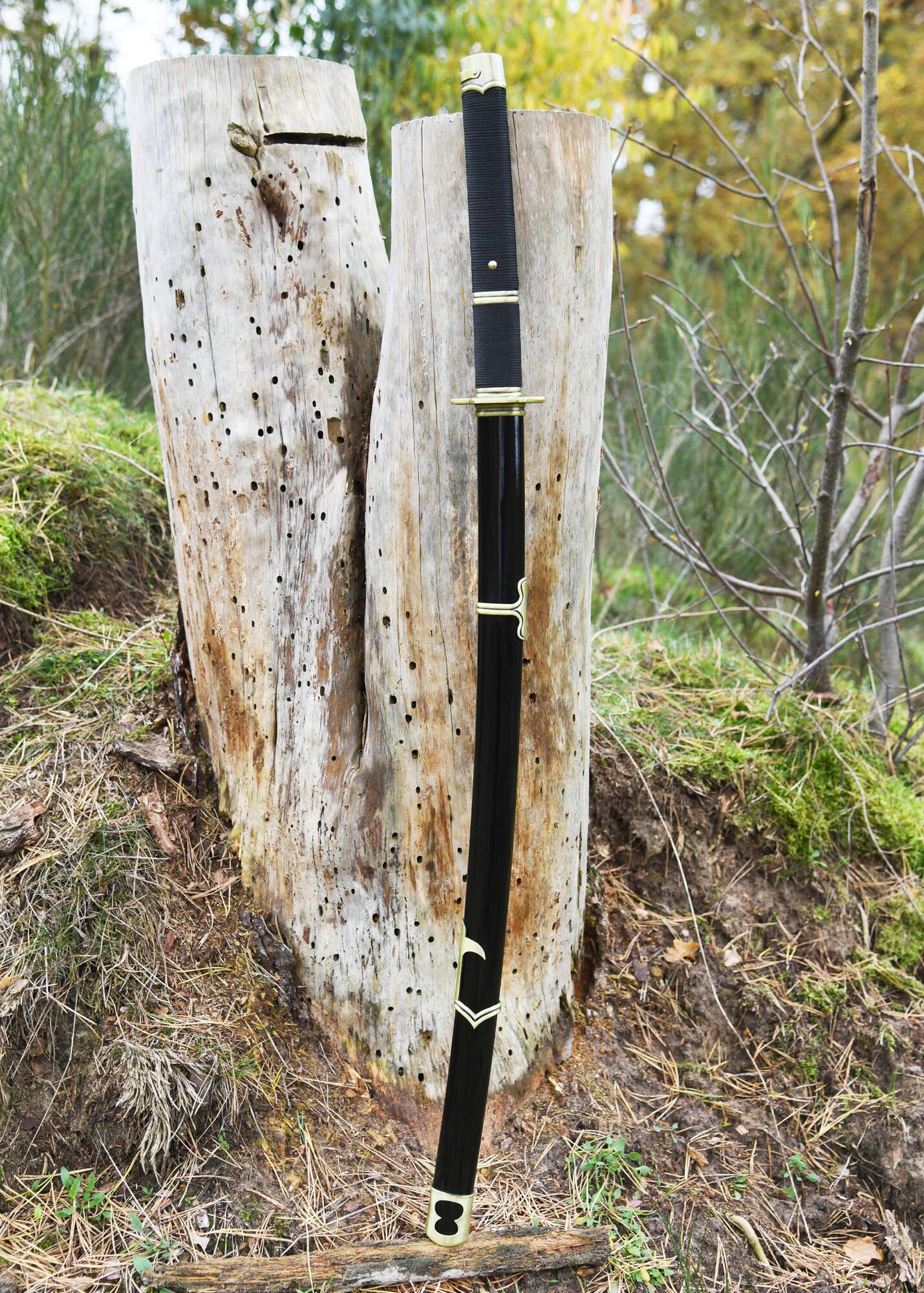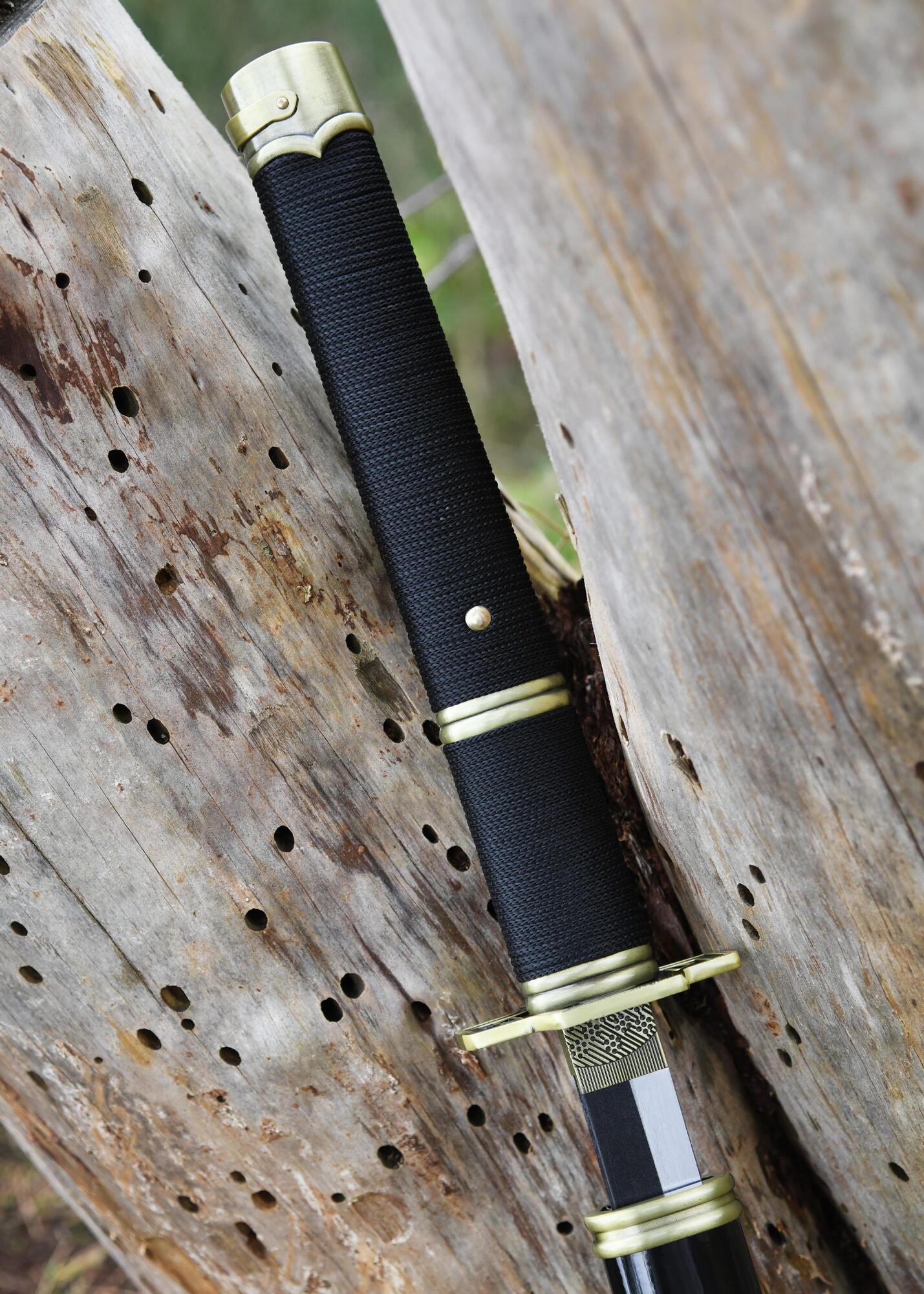Tsuka (håndtaget) er omviklet med slidstærk nylonsnor, som giver et sikkert greb og et stilrent look. De dekorative detaljer på både tsuka og saya er fremstillet i guldanodiseret aluminium – herunder den karakteristiske korsformede tsuba. Den sortlakerede saya (skede) er udført i træ og fuldender det mørke, militærinspirerede design.
