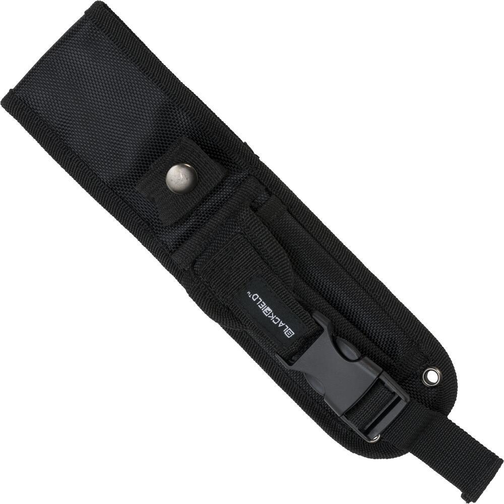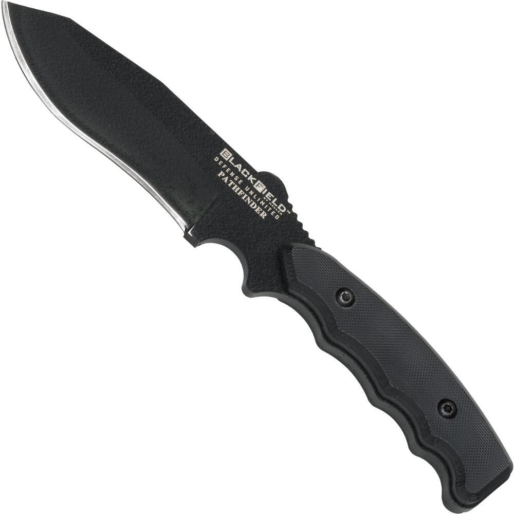 Taktisk kniv med et robust og markant design. Den sorte belagte klinge har en tykkelse på 5 mm, hvilket giver høj stabilitet og styrke. Håndtaget er fastgjort med skruer og fremstillet i næsten uopslideligt G10, som sikrer et sikkert og komfortabelt greb i hånden.