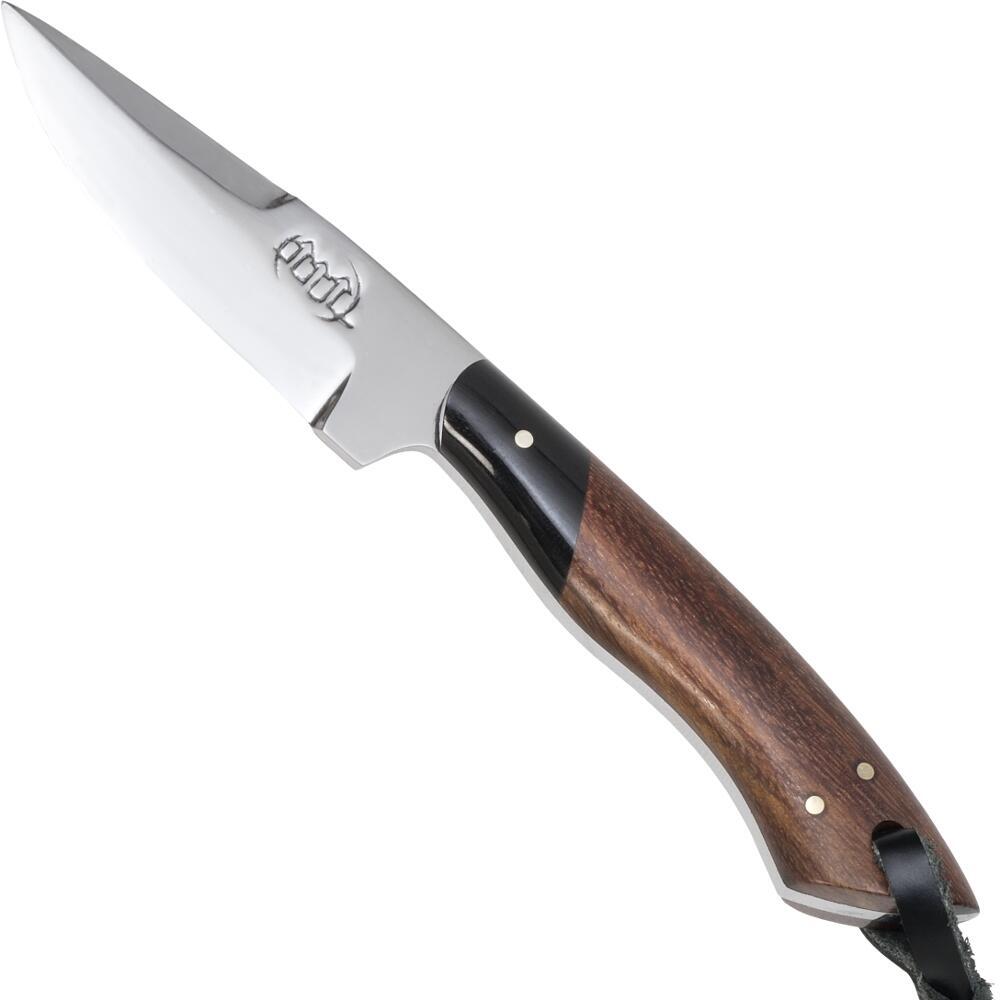Håndtaget er udført i smukt padouk-træ med elegante hornbolstre, som giver et eksklusivt og klassisk udtryk. I enden af håndtaget sidder en praktisk sikkerhedsrem, der øger kontrollen under brug. Kniven leveres med en håndlavet læderskede i høj kvalitet, som beskytter klingen og fuldender det håndværksmæssige look.