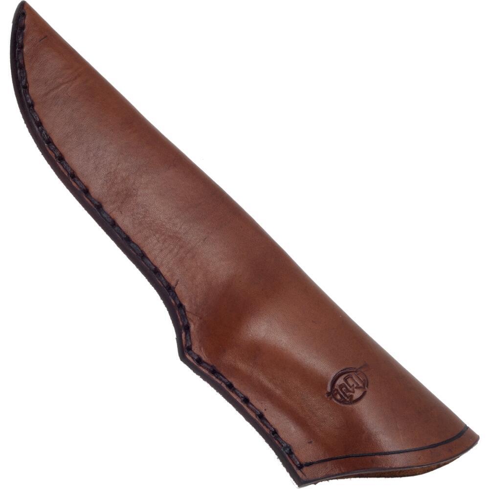 Håndtaget er udført i smukt padouk-træ, som giver et varmt, naturligt udtryk og et komfortabelt greb. Den solide parerstang i rustfrit stål beskytter hånden under arbejde og fuldender det klassiske design. Kniven leveres med en håndlavet læderskede i høj kvalitet, der sikrer både sikker opbevaring og stilfuld transport.
