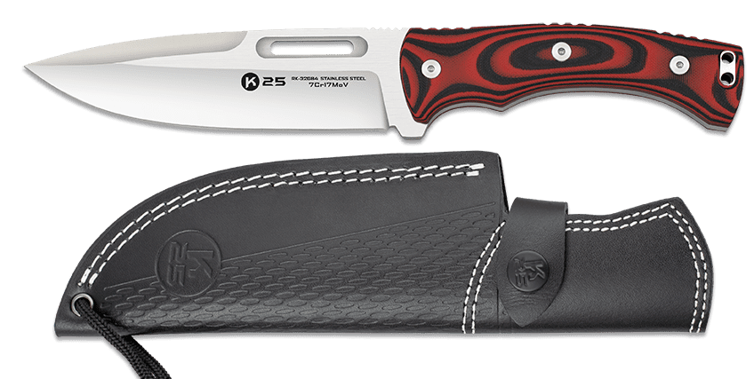 Kniven leveres med en læderskede med lukning, så den nemt og sikkert kan transporteres.