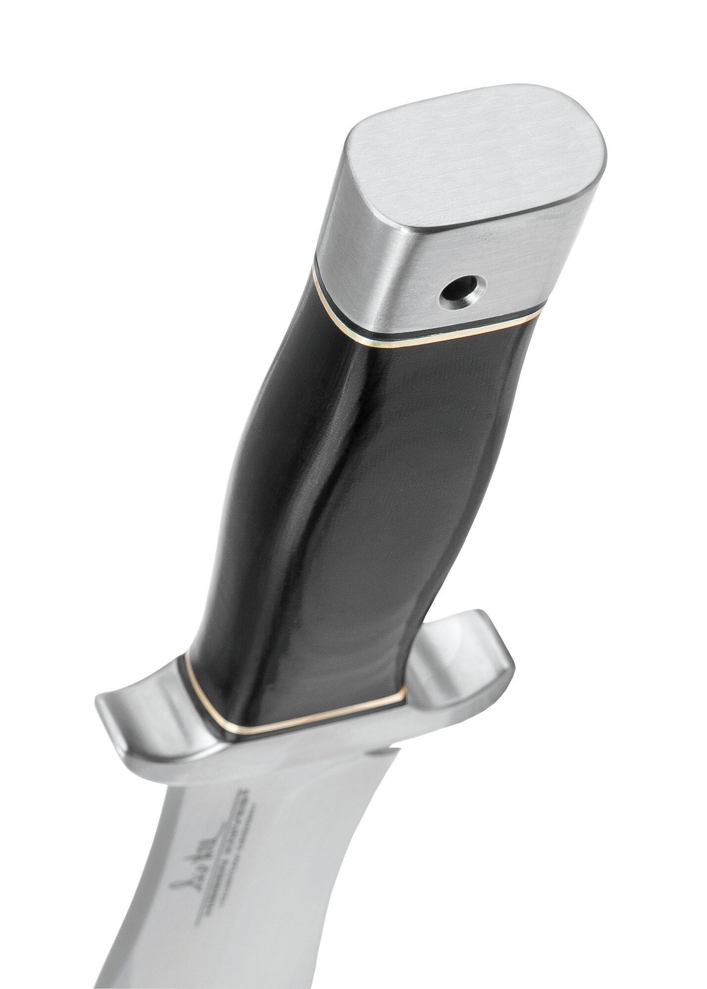 Håndtaget er udført i sort linen Micarta med elegante sølvfarvede detaljer samt parérstang og pommel i rustfrit stål. Kombinationen giver et eksklusivt og tidløst udtryk samtidig med et sikkert og komfortabelt greb.