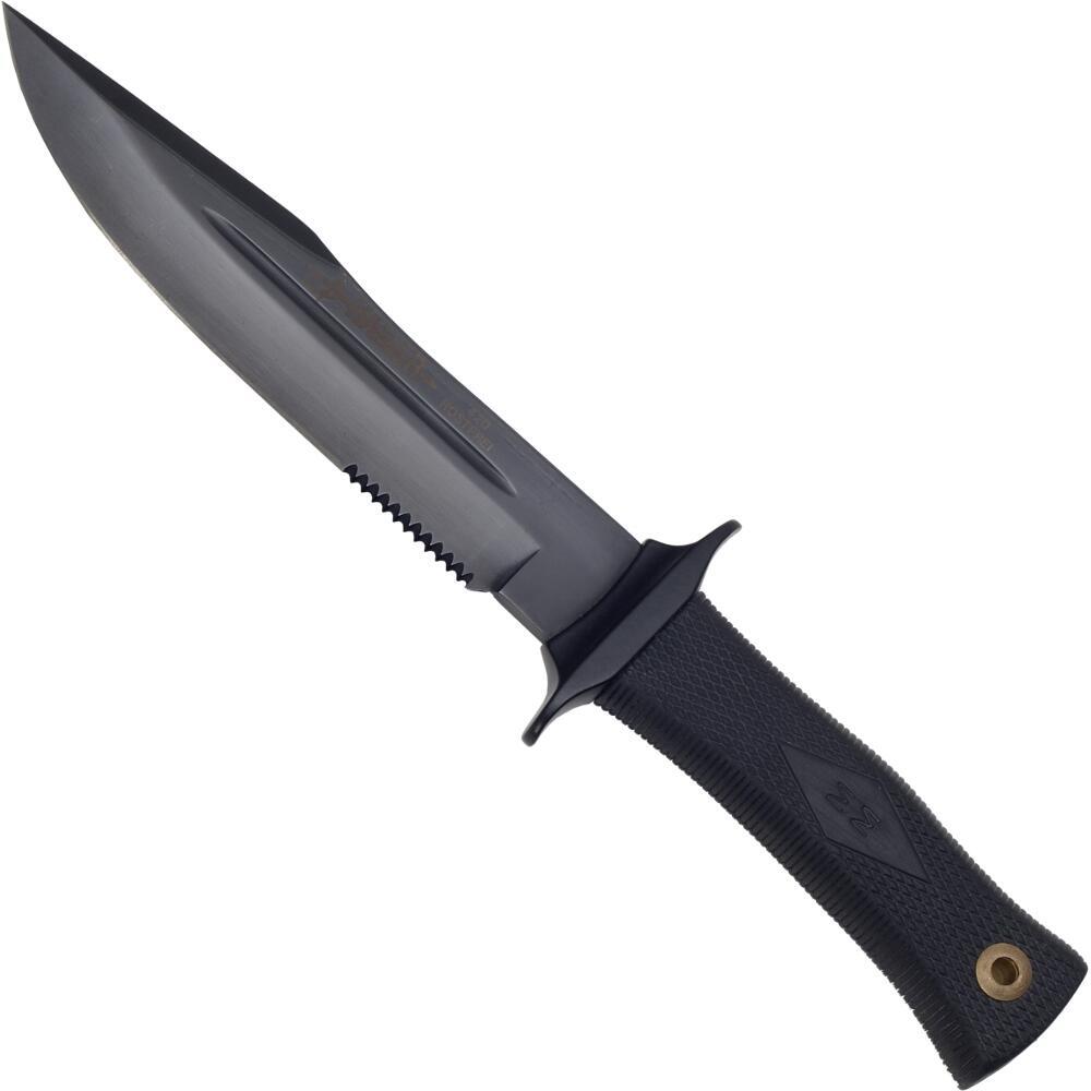 Håndtaget er udført i gummibelagt syntetisk materiale, der sikrer et skridsikkert og komfortabelt greb – selv i våde eller kolde forhold. Kniven leveres med en kvalitets læderskede, som beskytter klingen og gør den nem at transportere i bælte eller oppakning.