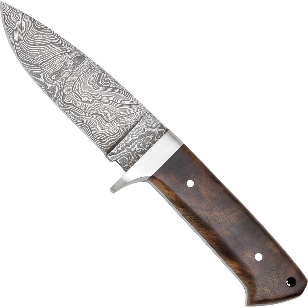 Klingen er fremstillet af lagdelt Damascus stål bestående af 1075 og 4340 kulstofstål, hvilket giver høj styrke, god skæreevne og lang levetid ved korrekt vedligeholdelse. De kraftige stålbolstre er formet som en solid parerstang, der effektivt beskytter hånden mod at glide frem under brug – en vigtig detalje ved jagt og krævende outdoor-opgaver.