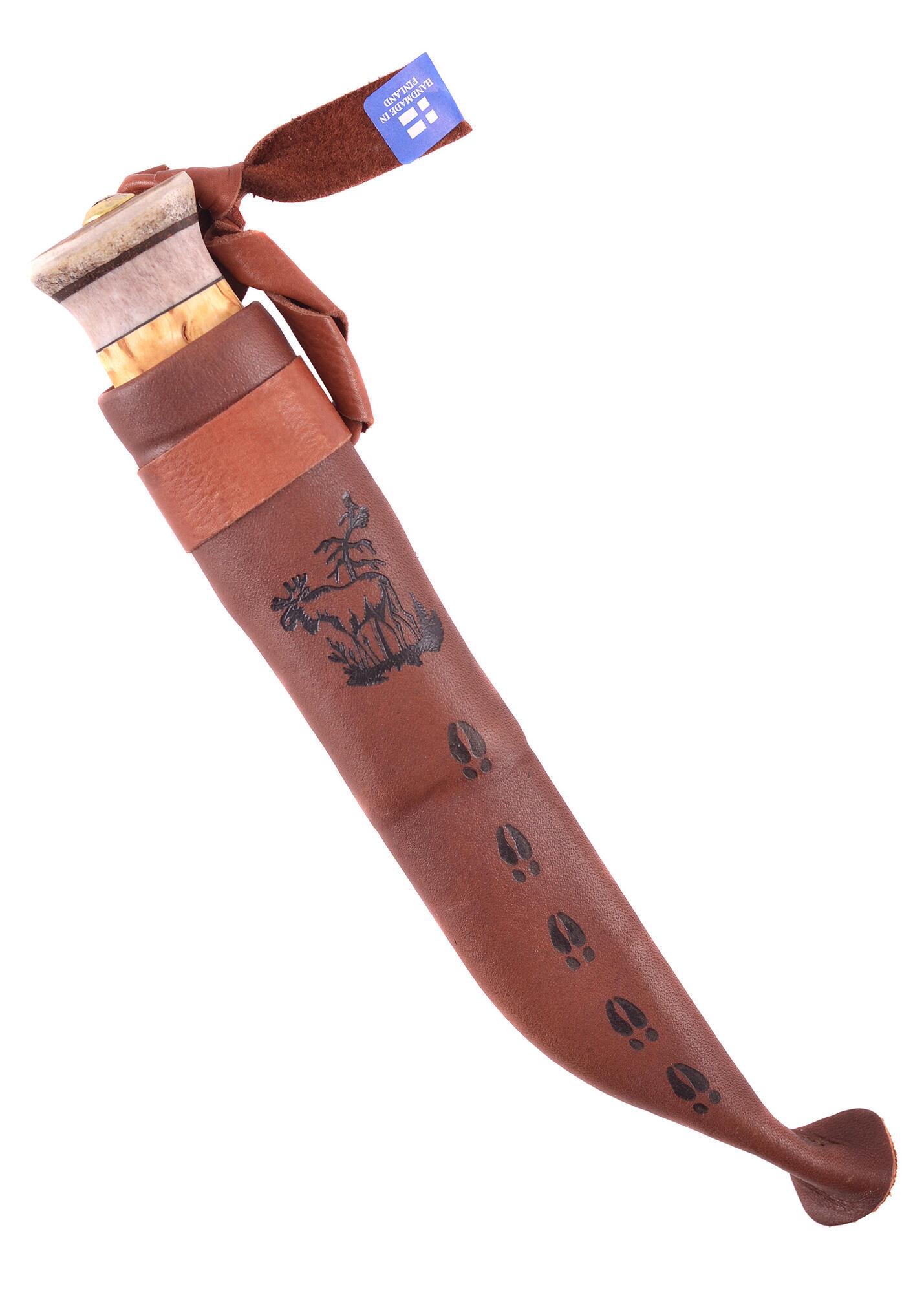 Kniven leveres komplet med en traditionel læderskede, som beskytter klingen og gør den nem at bære i bæltet under jagt og friluftsliv.