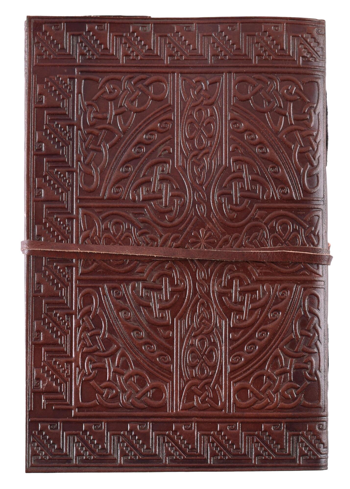 Denne praktiske notesbog er fremstillet af håndlavet papir og indbundet i præget læder med traditionel krydssyning. Den egner sig både som dagbog og som almindelig notesbog til adresser, bestillinger, skitser eller andre notater.
