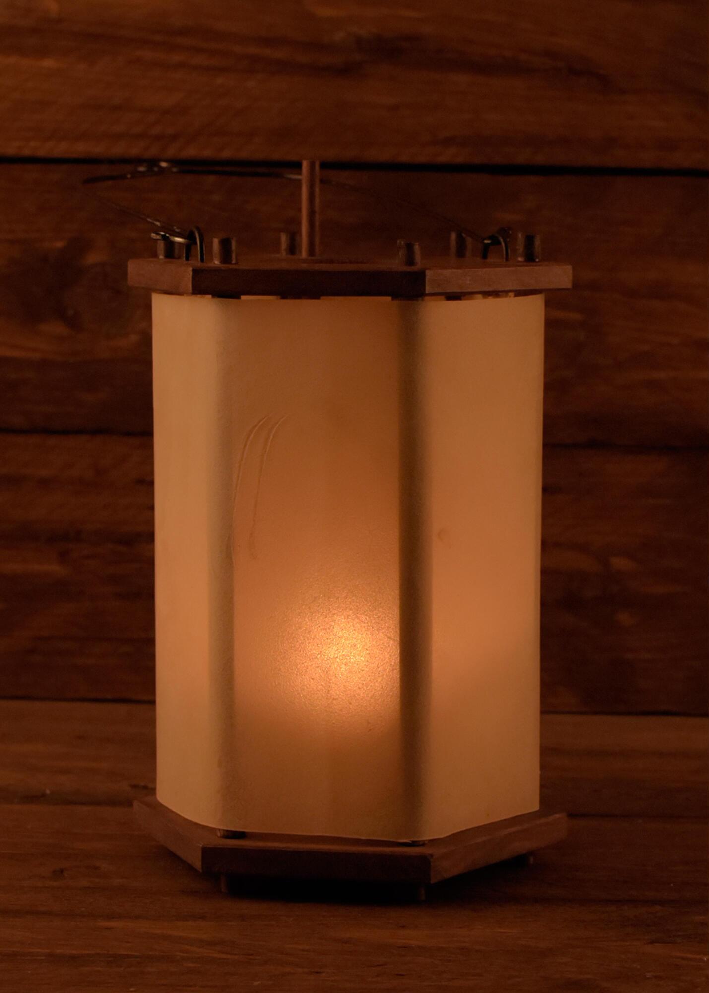 Denne smukke lanterne er en autentisk rekonstruktion af en middelalderlig lanterne fremstillet i træ med sider af råhud/pergament lavet af tyndt læder. Konstruktionen består af to sekskantede træplader, som er forbundet med lodrette træstave.