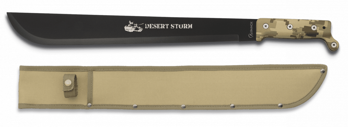Klingen måler hele 41,5 cm og er fremstillet i 3Cr13Mov stål med en slidstærk sort finish, som både beskytter og giver et råt udtryk. Den fuldtangede konstruktion sikrer maksimal styrke og stabilitet, så du kan arbejde med kraft og præcision.