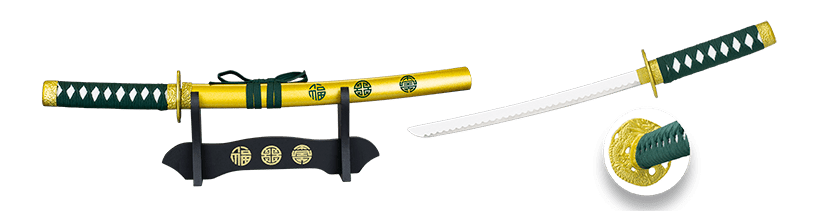 Designet uden skarp æg gør den ideel til udstilling. Håndtaget i træ med grøn omvikling skaber en flot kontrast til klingen, mens den klassiske tsuba fuldender det traditionelle udtryk.