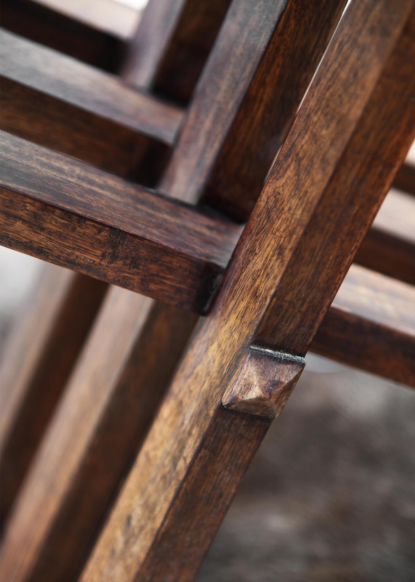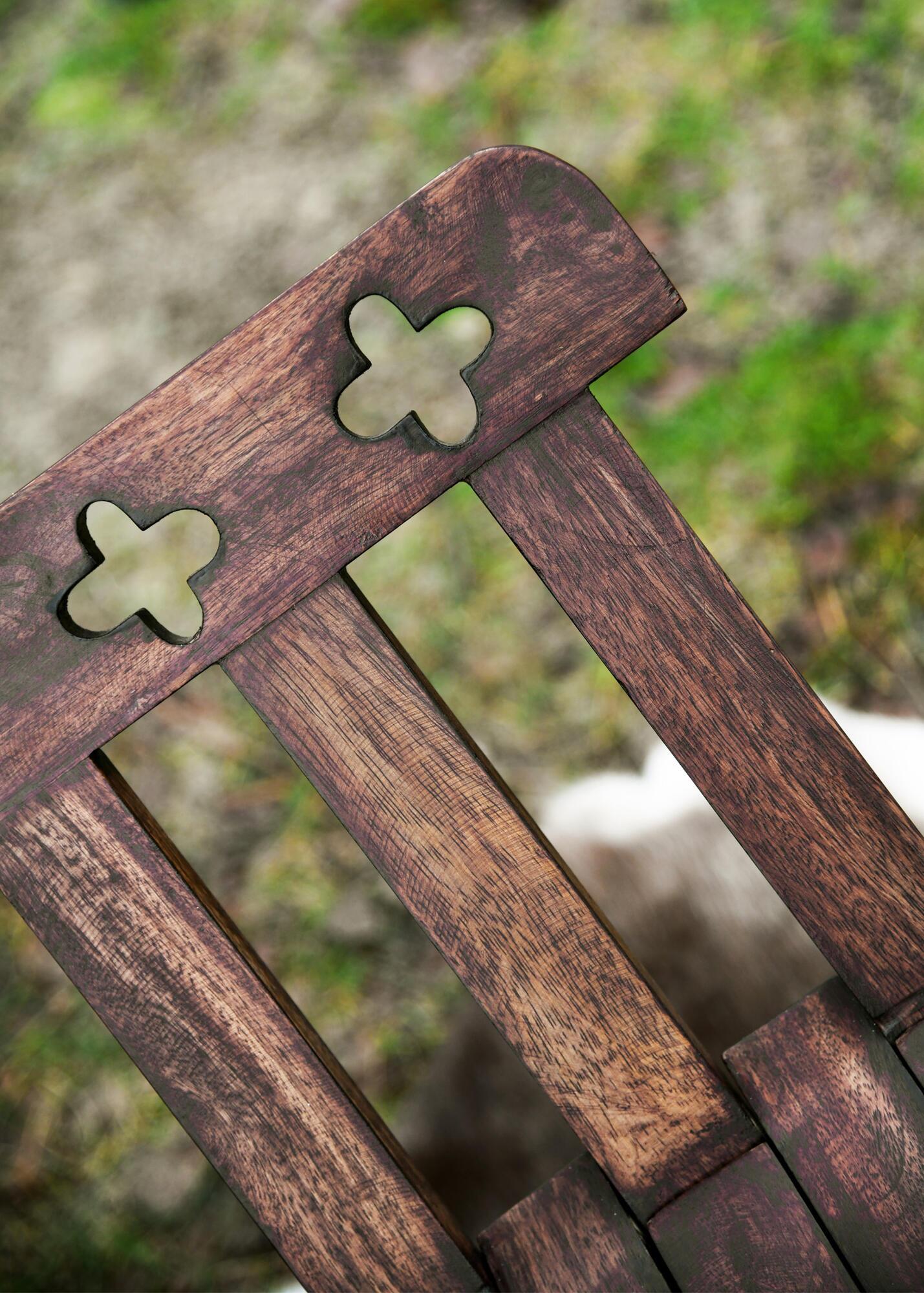 Stolen er fremstillet af stærkt og holdbart mangotræ. De dekorative firkløverformede udskæringer i armlænene giver stolen et flot historisk præg. De tætsiddende trælameller i sædet giver en god siddekomfort, og ønsker man ekstra blødhed, kan stolen nemt suppleres med et skind eller en pude.