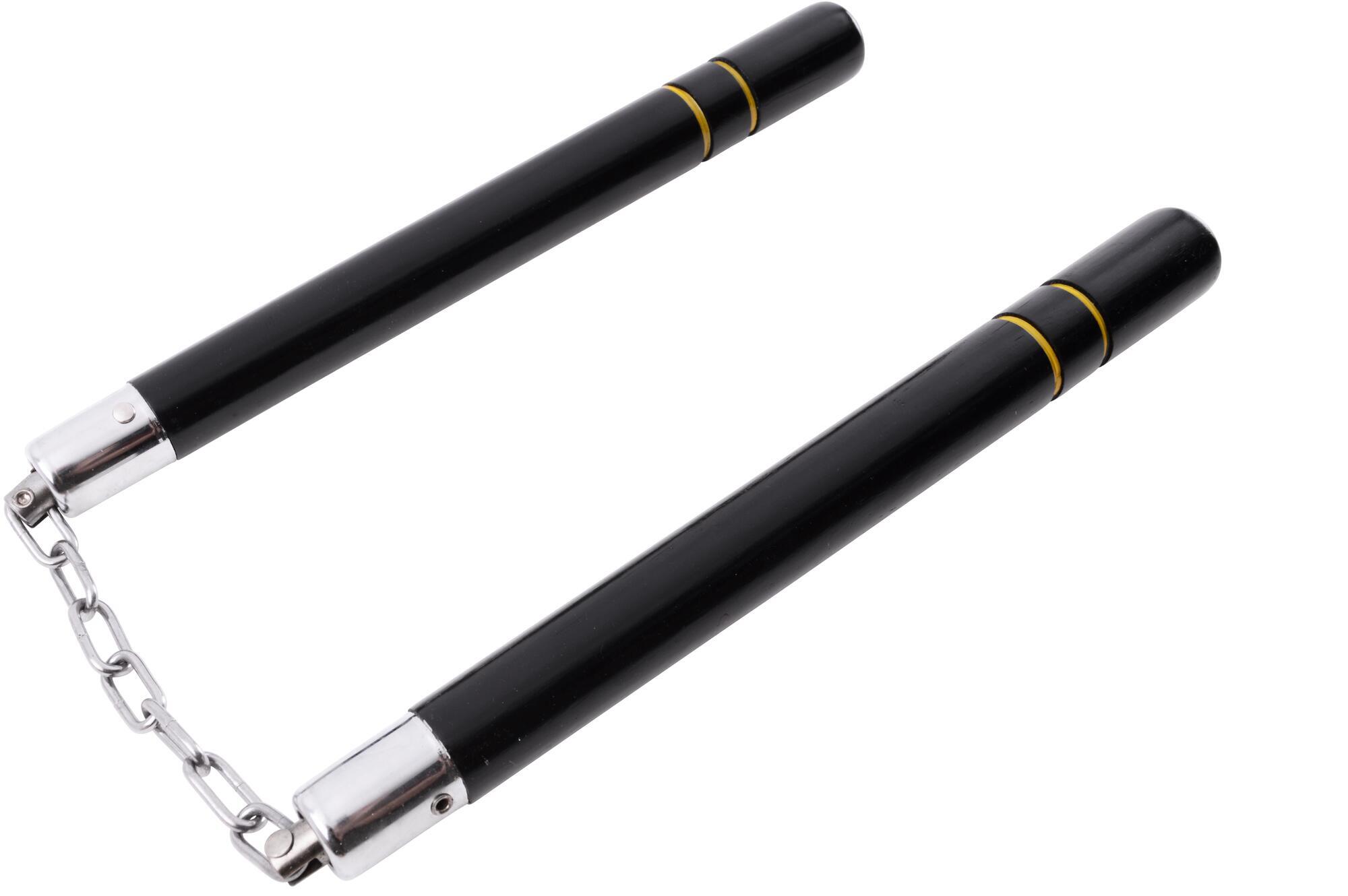 Klassisk træ-nunchaku med et markant design. Håndtagene er fremstillet i lakeret træ og dekoreret med indgraverede ringe, som giver modellen et karakteristisk kampsportslook.