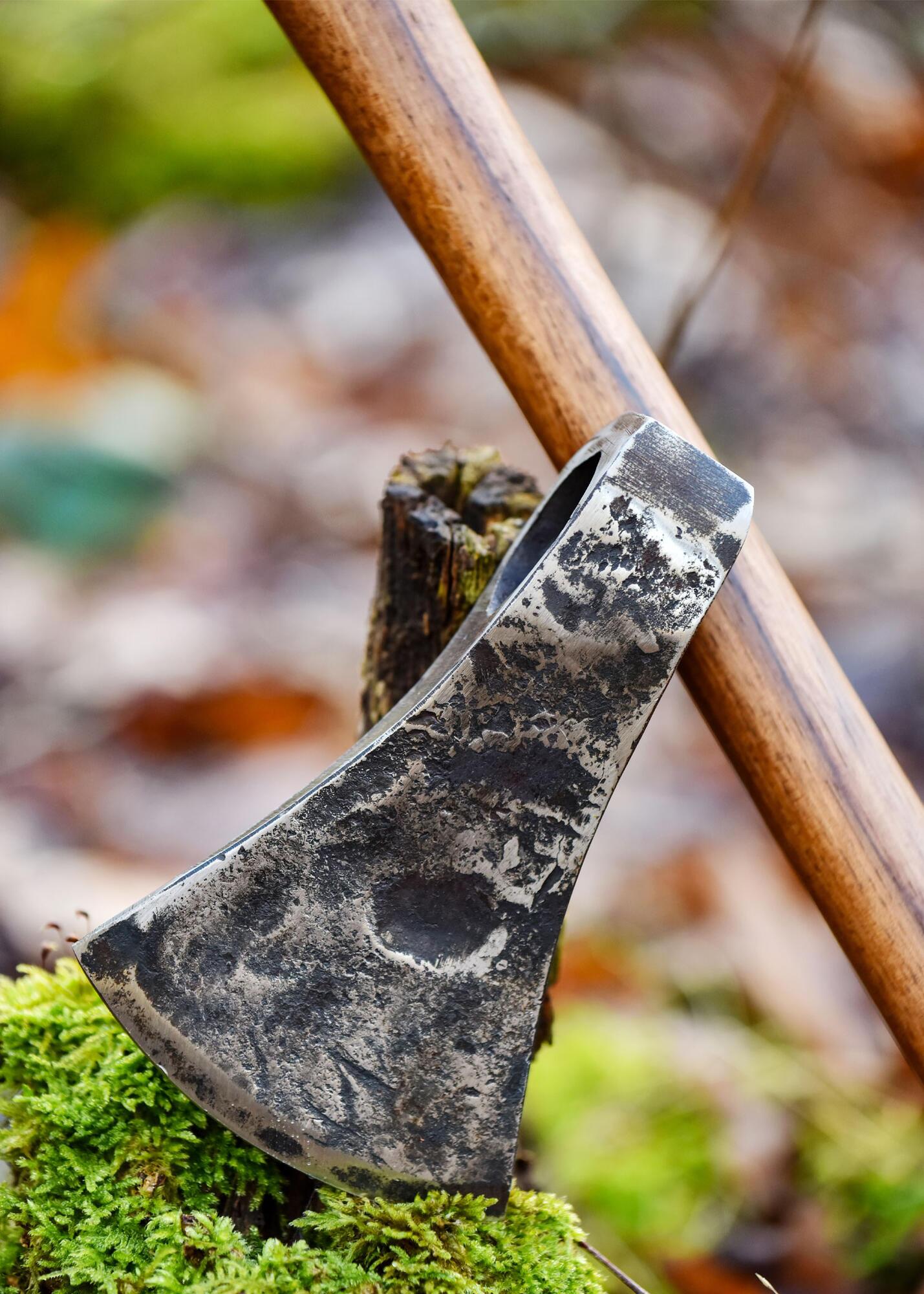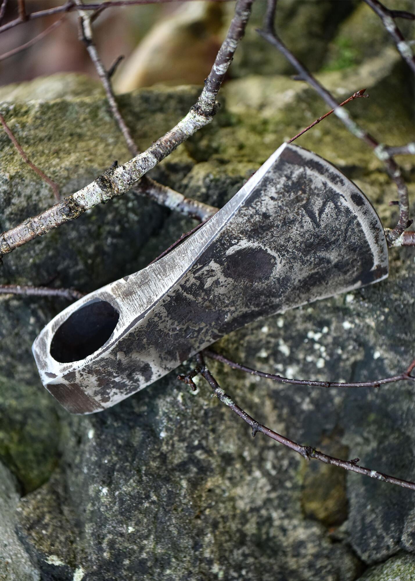 Håndsmedet øksehoved i kulstofstål, udviklet til kampopvisning og reenactment. Den solide konstruktion og materialetykkelse gør modellen velegnet til brug i historisk kamptræning.