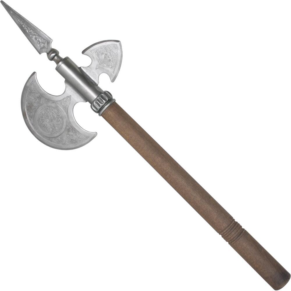 Øksehovedet er fremstillet i carbonstål og prydet med indviklede graveringer på klingerne, som tilfører karakter og historisk stemning. Øverst på hovedet findes en lang spike, der understreger det dramatiske og krigeriske design. Skaftet er udført i træ, hvilket giver en naturlig balance og et klassisk helhedsindtryk.