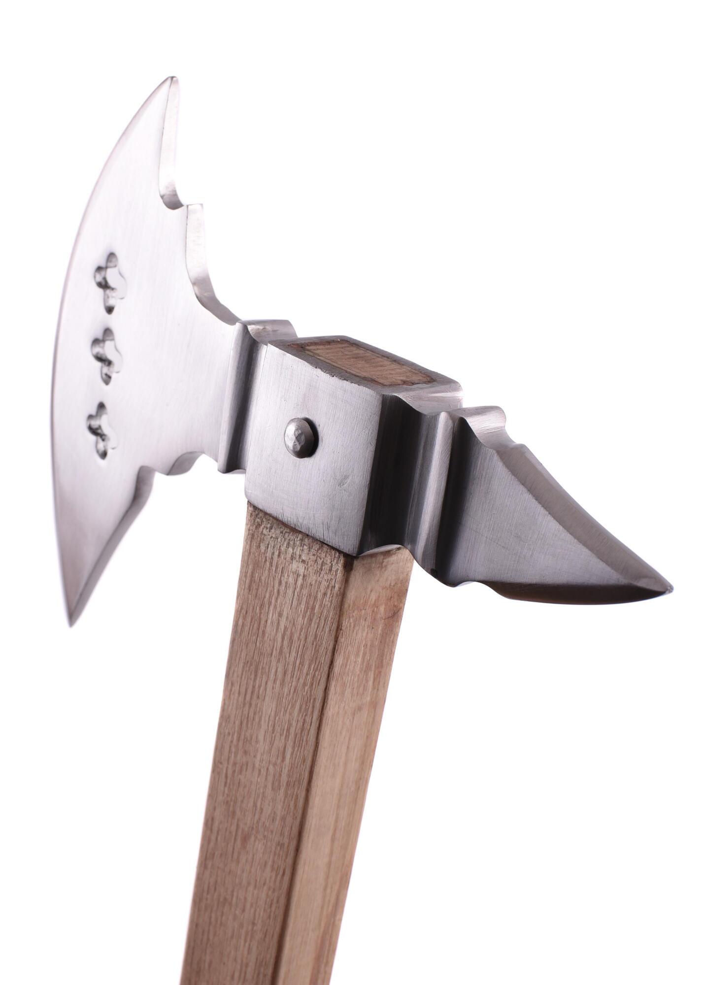 Flot og stemningsfuld replika af en kampøkse fra omkring år 1460. Denne type økse var særligt populær blandt rytterenheder, hvor den blev anvendt i nærkamp.