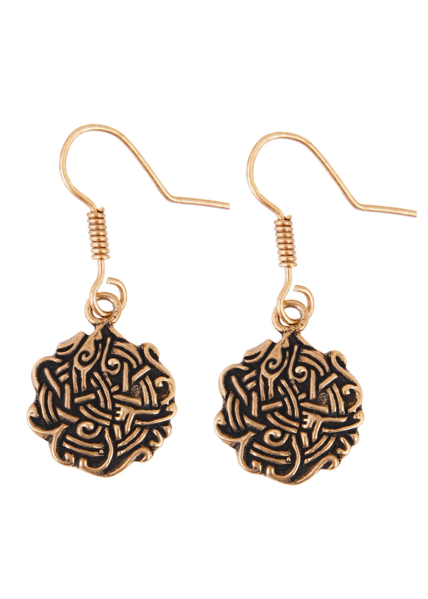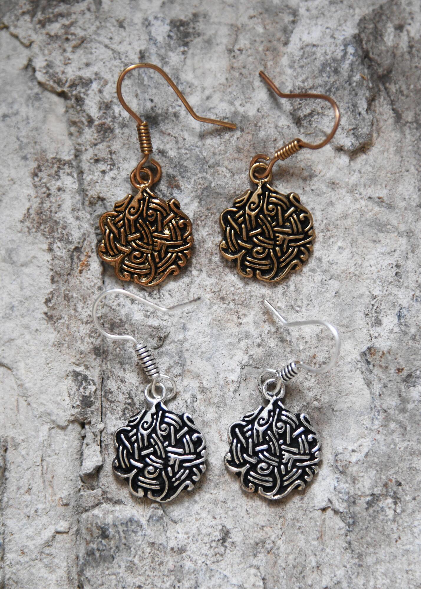Disse smukke vikingøreringe er udsmykket med et klassisk knudemønster inspireret af ornamenter fra vikingetiden. De sammenflettede linjer giver smykket et karakteristisk nordisk udtryk og er et velkendt motiv i både vikingernes kunst og smykkearbejde.