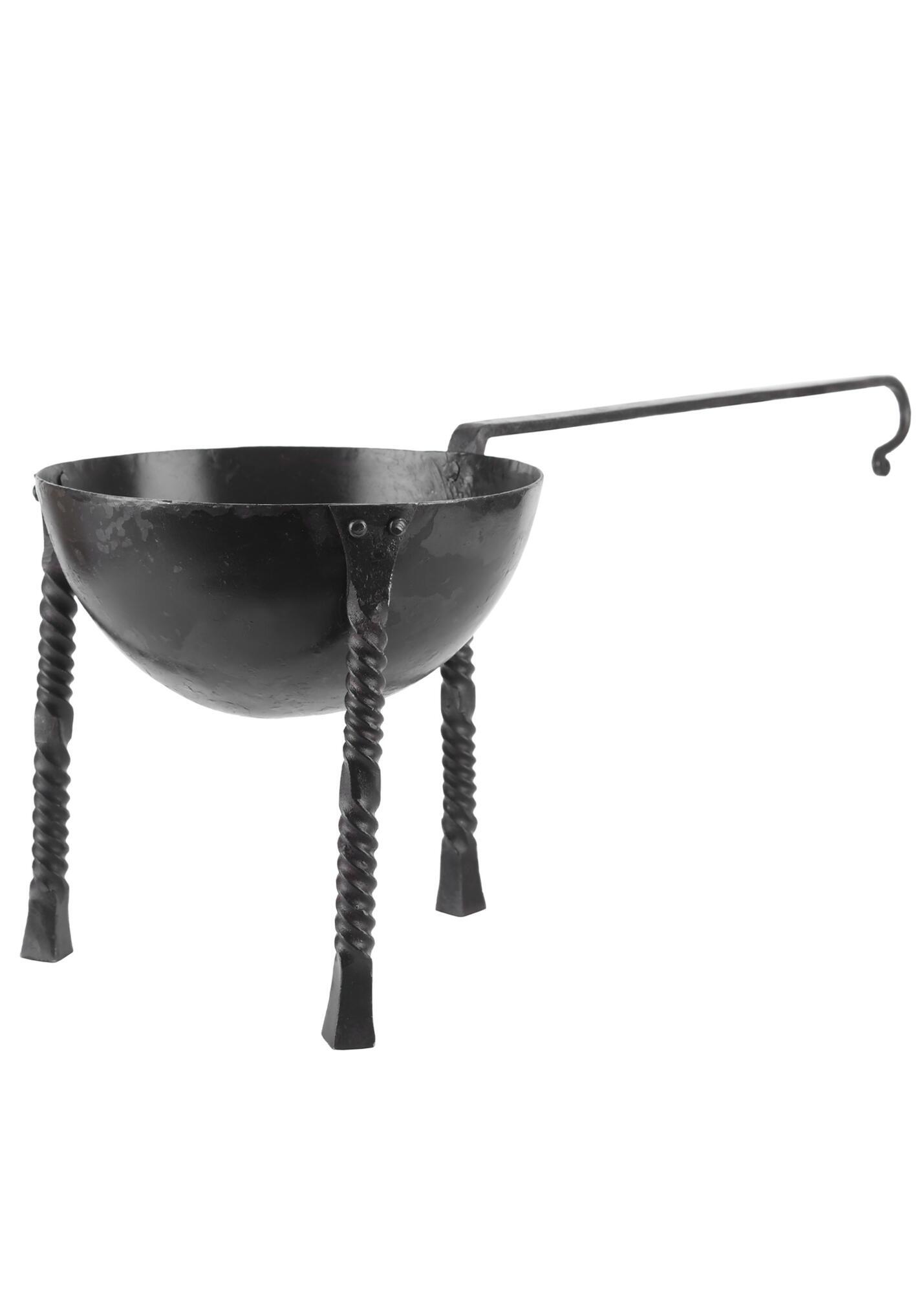 Denne reproduktion er håndsmedet i kraftigt stål. De tre dekorativt snoede ben er fastgjort med nitter, hvilket sikrer stabilitet i gløderne. Det lange håndtag gør det lettere at flytte gryden væk fra ilden, og krogen i enden gør det muligt at hænge den op efter brug.
