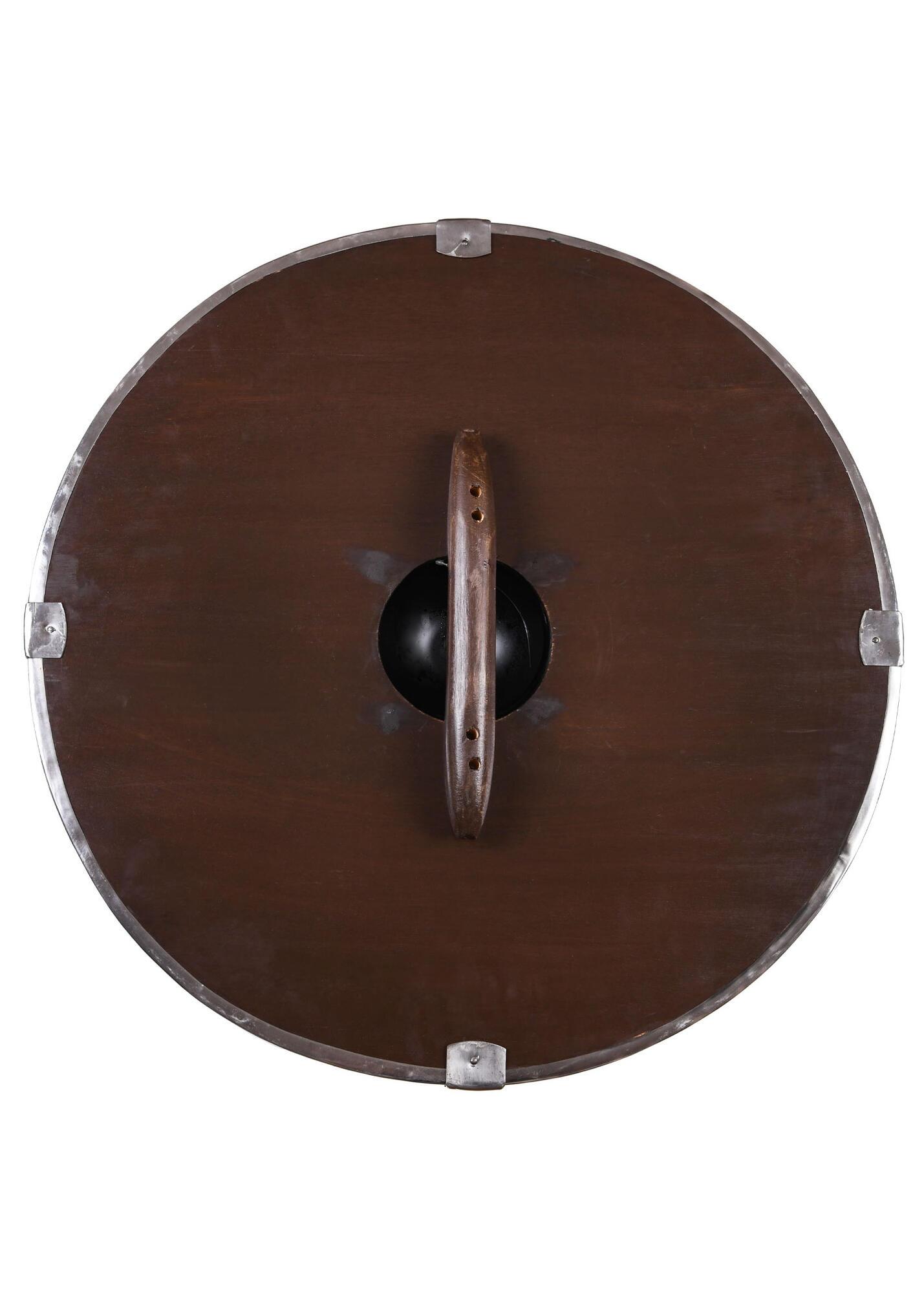 Den medfølgende stålbule (umbo) monteres nemt med de medfølgende nitter og giver god plads til hånden. Skjoldets kant er forstærket med metal, og bagsiden er udstyret med et solidt træhåndtag.